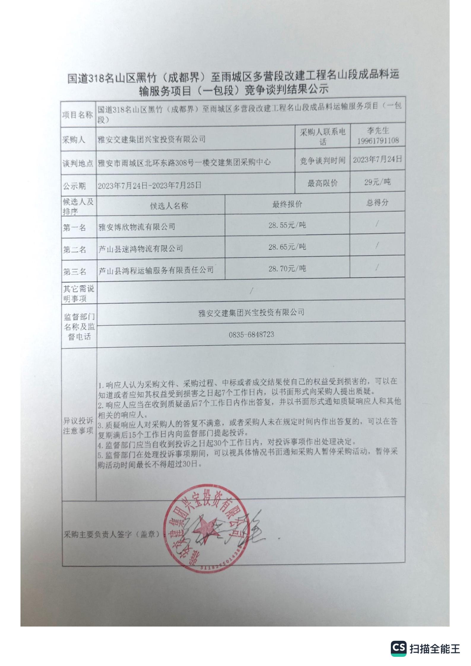雅安交建集團興寶投資有限公司國道318名山區(qū)黑竹(成都界)至雨城區(qū)多營段改建工程名山段成品料運輸服務(wù)項目(二包段)競爭談判結(jié)果公示