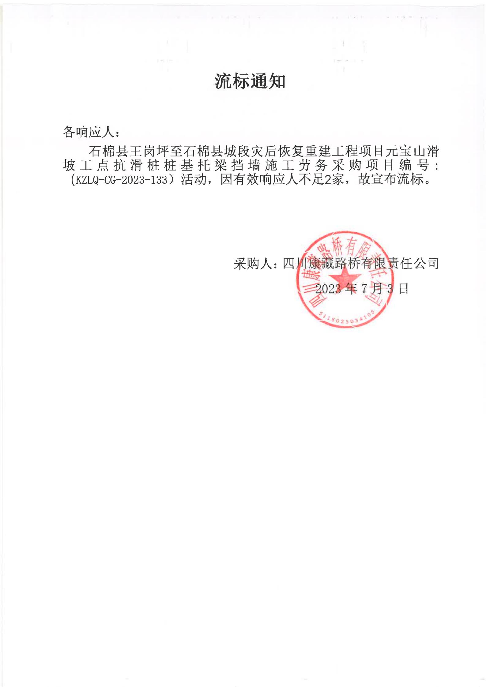 四川康藏路橋有限責任公司石棉縣王崗坪至石棉縣城段災后恢復重建工程項目元寶山滑坡工點抗滑樁樁基托梁擋墻施工勞務采購流標通知