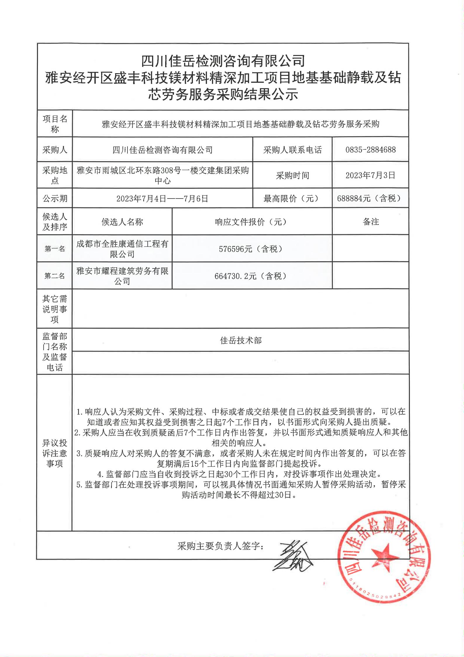 四川佳岳檢測(cè)咨詢有限公司雅安經(jīng)開區(qū)盛豐科技鎂材料精深加工項(xiàng)目地基基礎(chǔ)靜載及鉆芯服務(wù)采購結(jié)果公示
