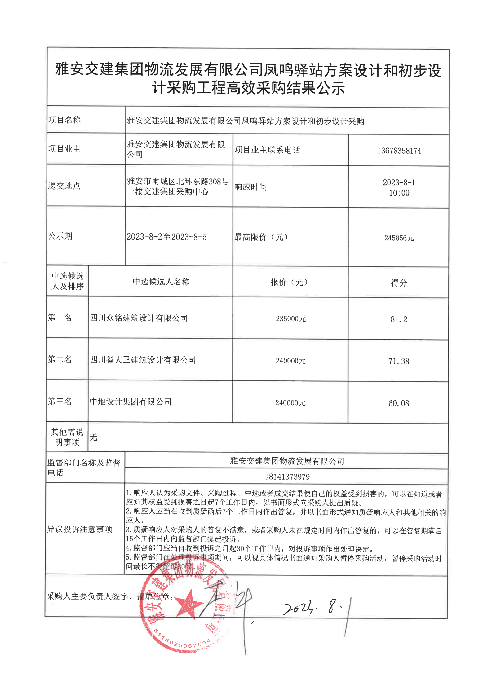 雅安交建集團(tuán)物流發(fā)展有限公司鳳鳴驛站方案設(shè)計(jì)和初步設(shè)計(jì)采購(gòu)工程高效采購(gòu)結(jié)果公示