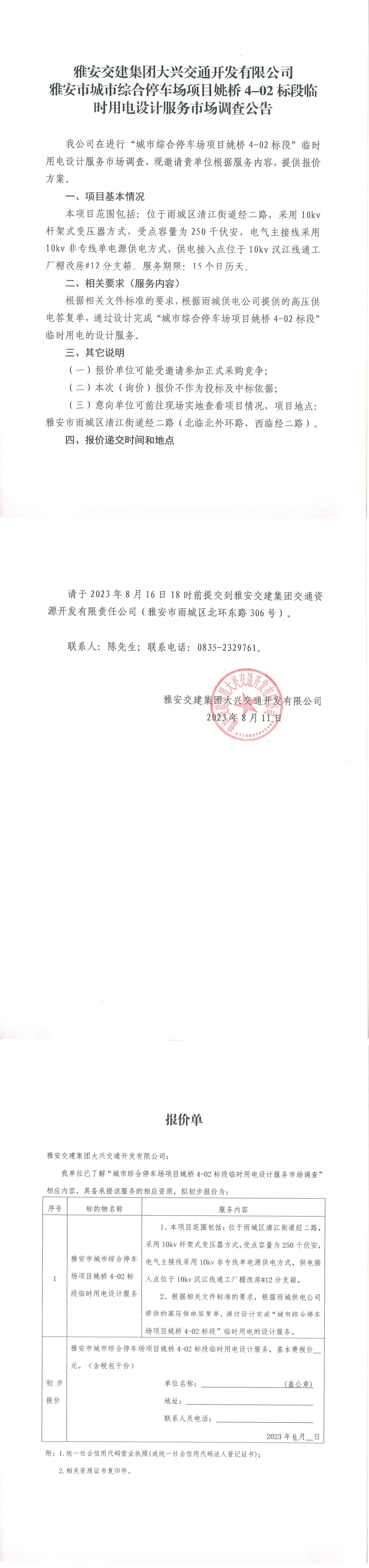 雅安交建集團(tuán)大興交通開發(fā)有限公司雅安市城市綜合停車場項(xiàng)目姚橋4-02標(biāo)段臨時(shí)用電設(shè)計(jì)服務(wù)市場調(diào)查公告