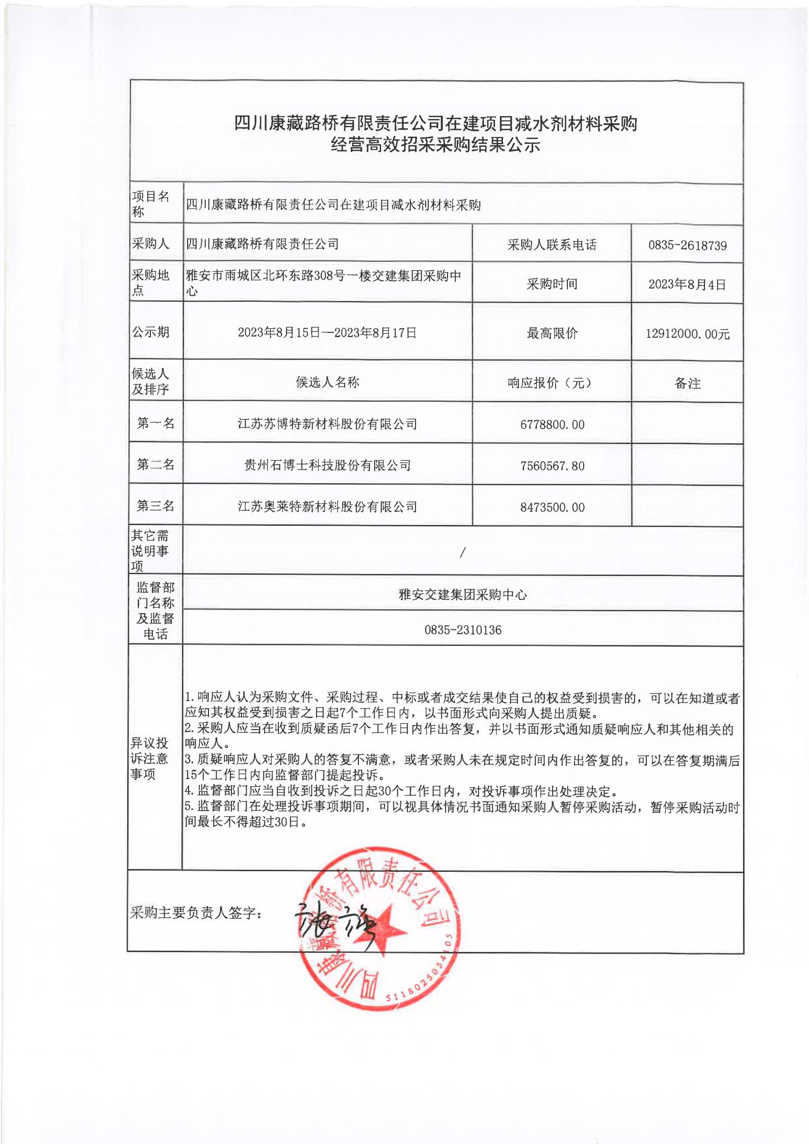 四川康藏路橋有限責(zé)任公司在建項(xiàng)目減水劑材料采購經(jīng)營高效招采采購結(jié)果公示