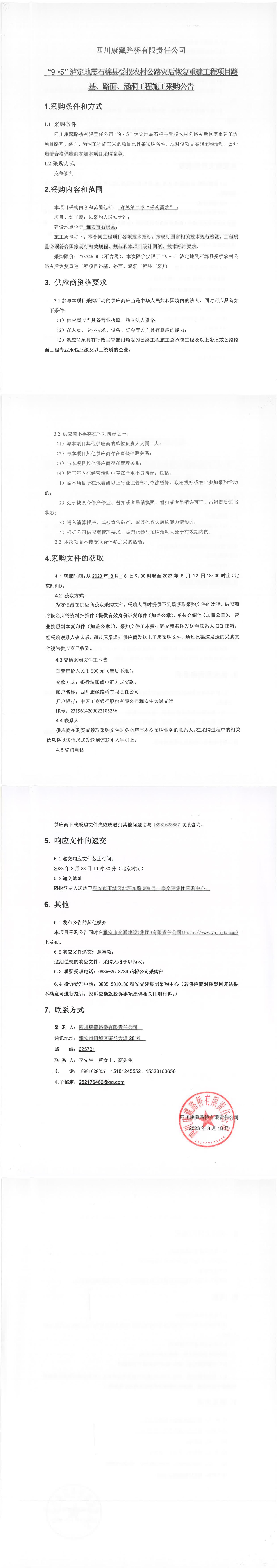 四川康藏路橋有限責任公司“9·5”瀘定地震石棉縣受損農(nóng)村公路災(zāi)后恢復(fù)重建工程項目路基、路面、涵洞工程施工采購公告