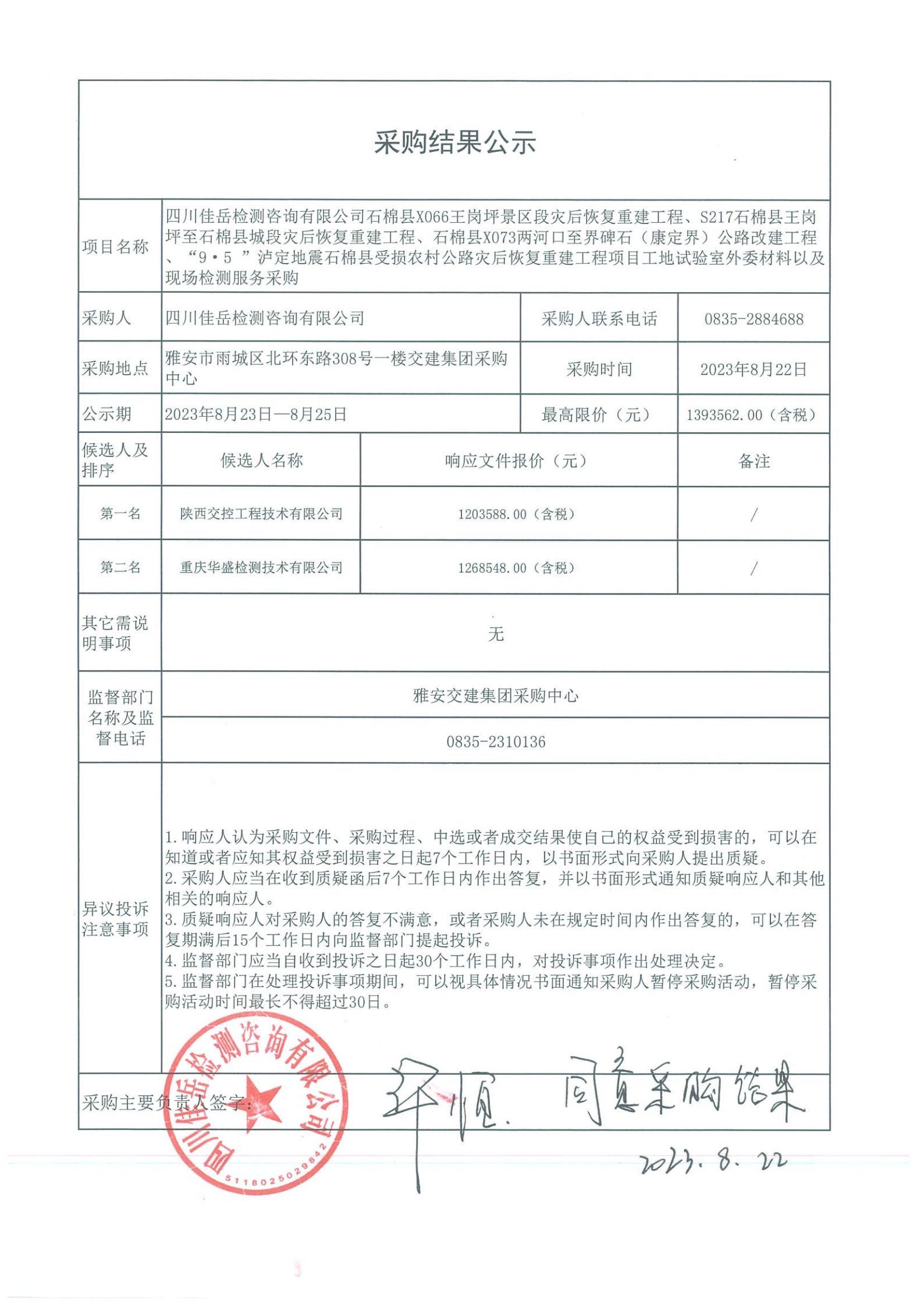 四川佳岳檢測(cè)咨詢有限公司石棉縣X066王崗坪至王崗坪景區(qū)段災(zāi)后恢復(fù)重建工程、S217石棉縣王崗坪至石棉縣城段災(zāi)后恢復(fù)重建工程、石棉縣X073兩河口至界碑石(康定界)公路改建工程、“9·5”瀘定地震石棉縣受損農(nóng)村公路災(zāi)后恢復(fù)重建工程項(xiàng)目外委材料以及現(xiàn)場(chǎng)檢測(cè)試驗(yàn)檢測(cè)服務(wù)采購庫內(nèi)競(jìng)價(jià)結(jié)果公示
