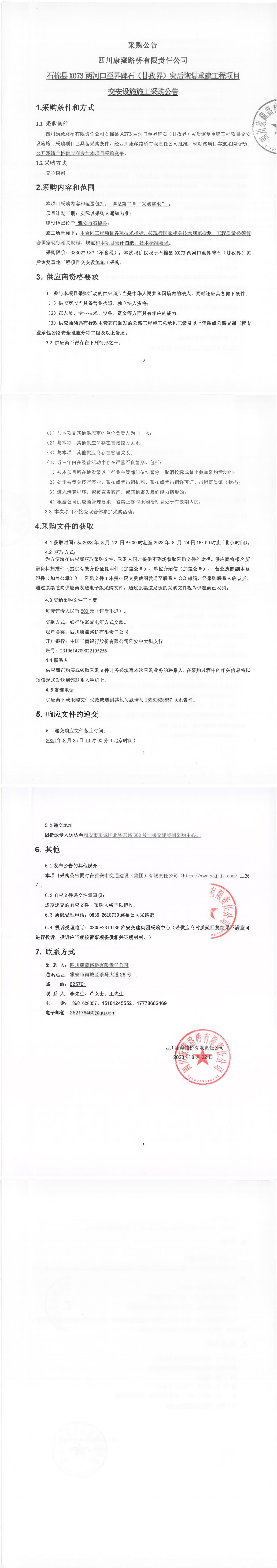 四川康藏路橋有限責任公司石棉縣X073兩河口至界碑石(甘孜界)災后恢復重建工程項目交安設施施工采購公告