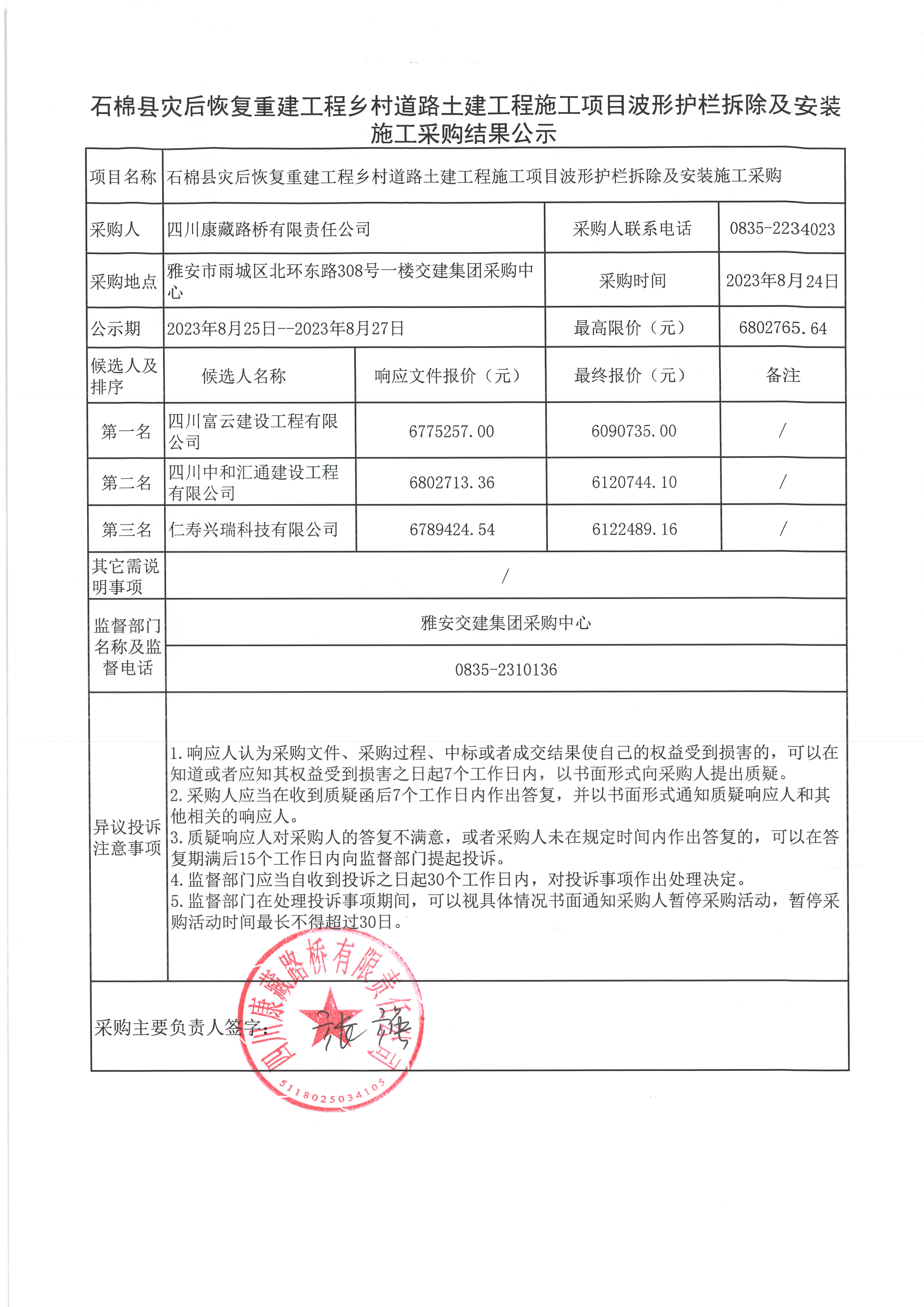石棉縣災(zāi)后恢復(fù)重建工程鄉(xiāng)村道路土建工程施工項目波形護欄拆除及安裝施工采購結(jié)果公示