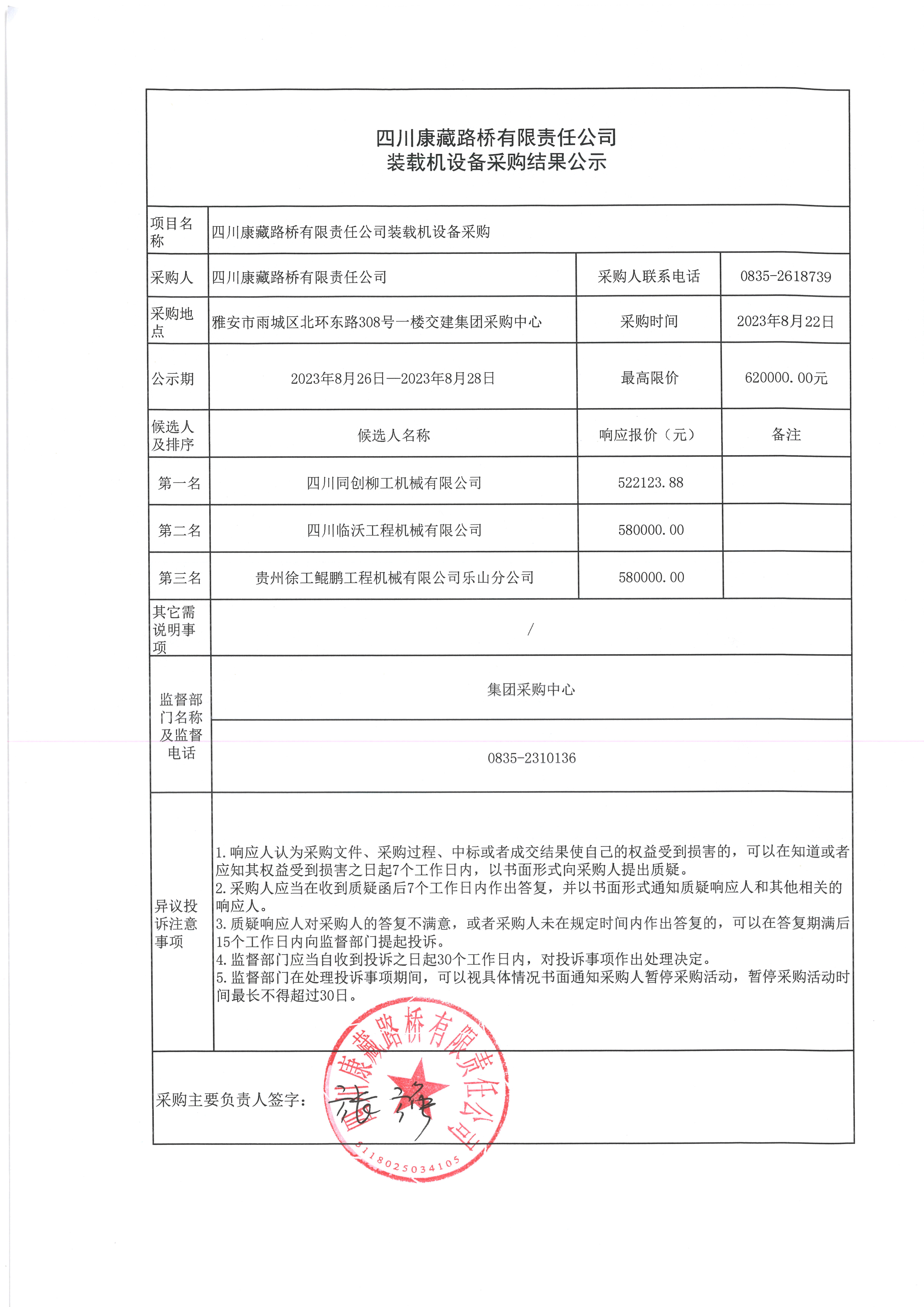 四川康藏路橋有限責(zé)任公司裝載機(jī)設(shè)備采購(gòu)結(jié)果公示
