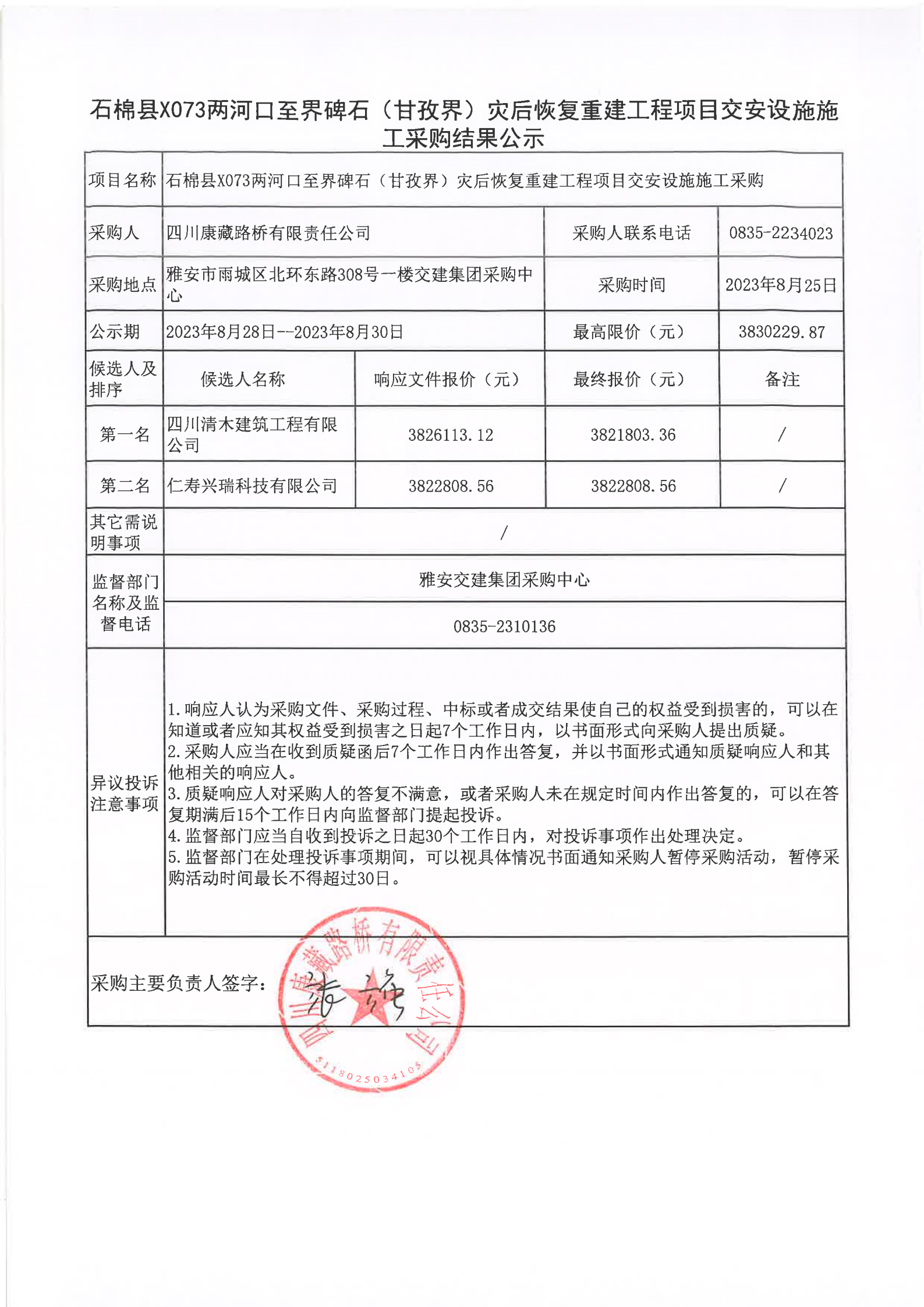 四川康藏路橋有限責(zé)任公司石棉縣X073兩河口至界碑石(甘孜界)災(zāi)后恢復(fù)重建工程項目交安設(shè)施施工采購結(jié)果公示