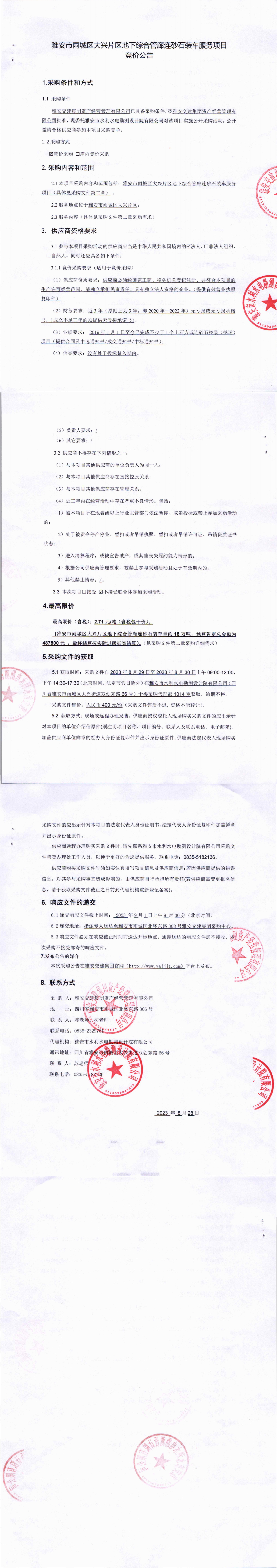 雅安交建集團(tuán)資產(chǎn)經(jīng)營管理有限公司雅安市雨城區(qū)大興片區(qū)地下綜合管廊連砂石裝車服務(wù)項(xiàng)目競價(jià)公告