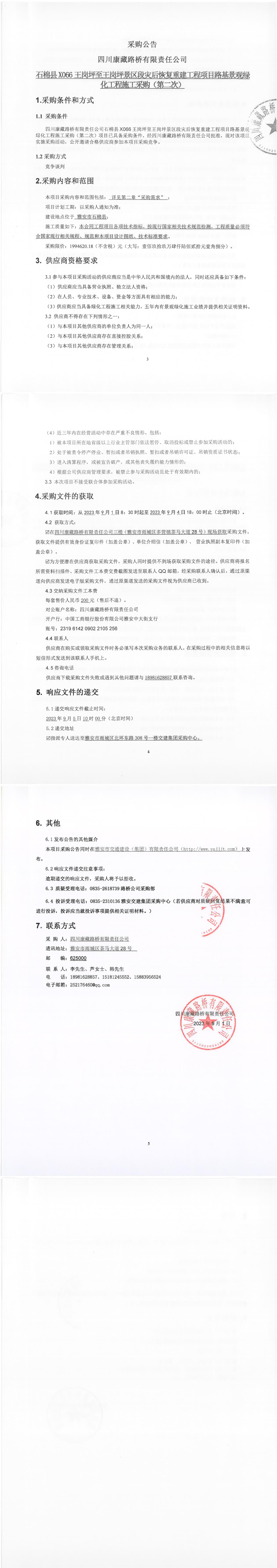 四川康藏路橋有限責(zé)任公司石棉縣X066王崗坪至王崗坪景區(qū)段災(zāi)后恢復(fù)重建工程項(xiàng)目路基景觀綠化工程施工采購(第二次)