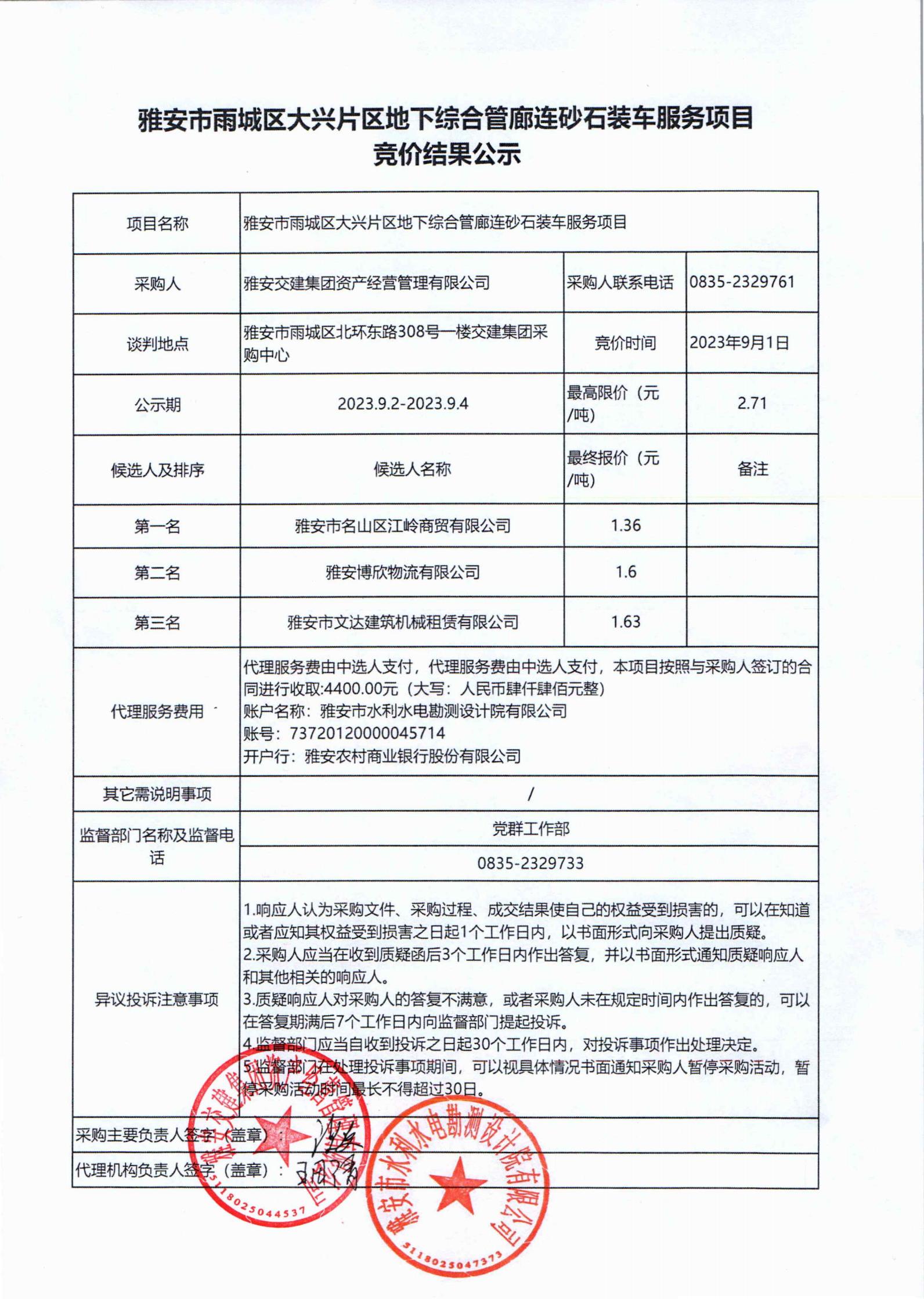 雅安交建集團(tuán)資產(chǎn)經(jīng)營(yíng)管理有限公司大興片區(qū)地下綜合管廊連砂石裝車(chē)服務(wù)項(xiàng)目競(jìng)價(jià)結(jié)果公示