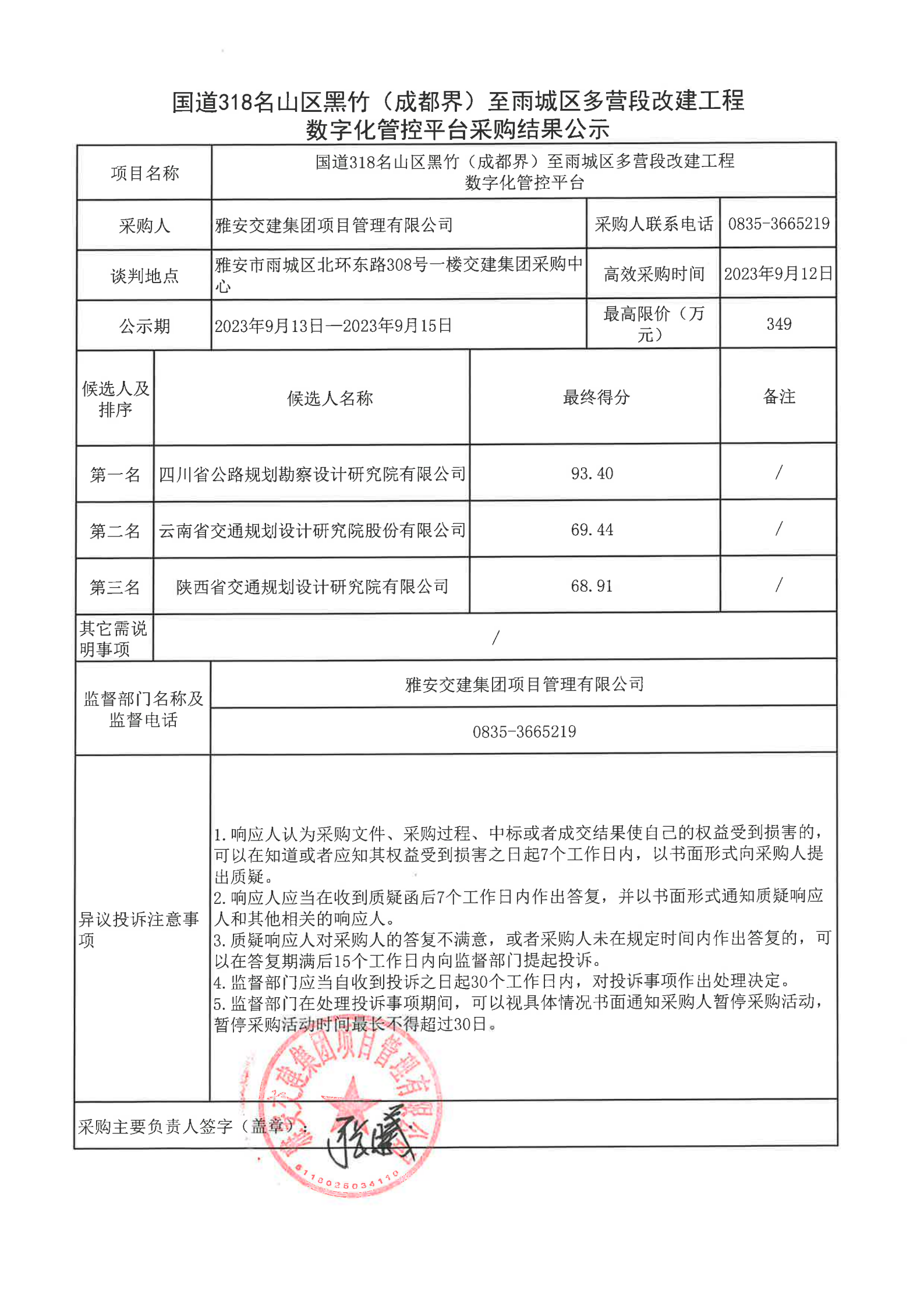 雅安交建集團項目管理有限公司國道318名山區(qū)黑竹(成都界)至雨城區(qū)多營段改建工程數字化管控平臺采購結果公示