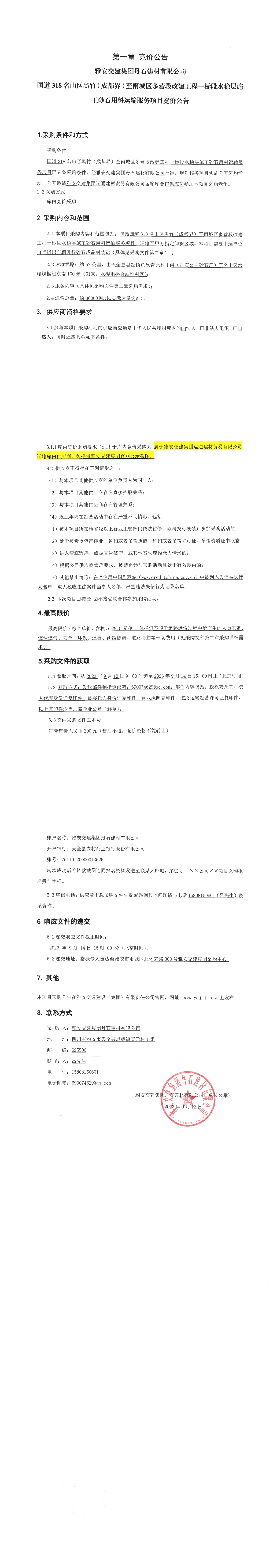雅安交建集團丹石建材有限公司國道318名山區(qū)黑竹(成都界)至雨城區(qū)多營段改建工程一標段水穩(wěn)層施工砂石用料運輸服務(wù)項目競價公告