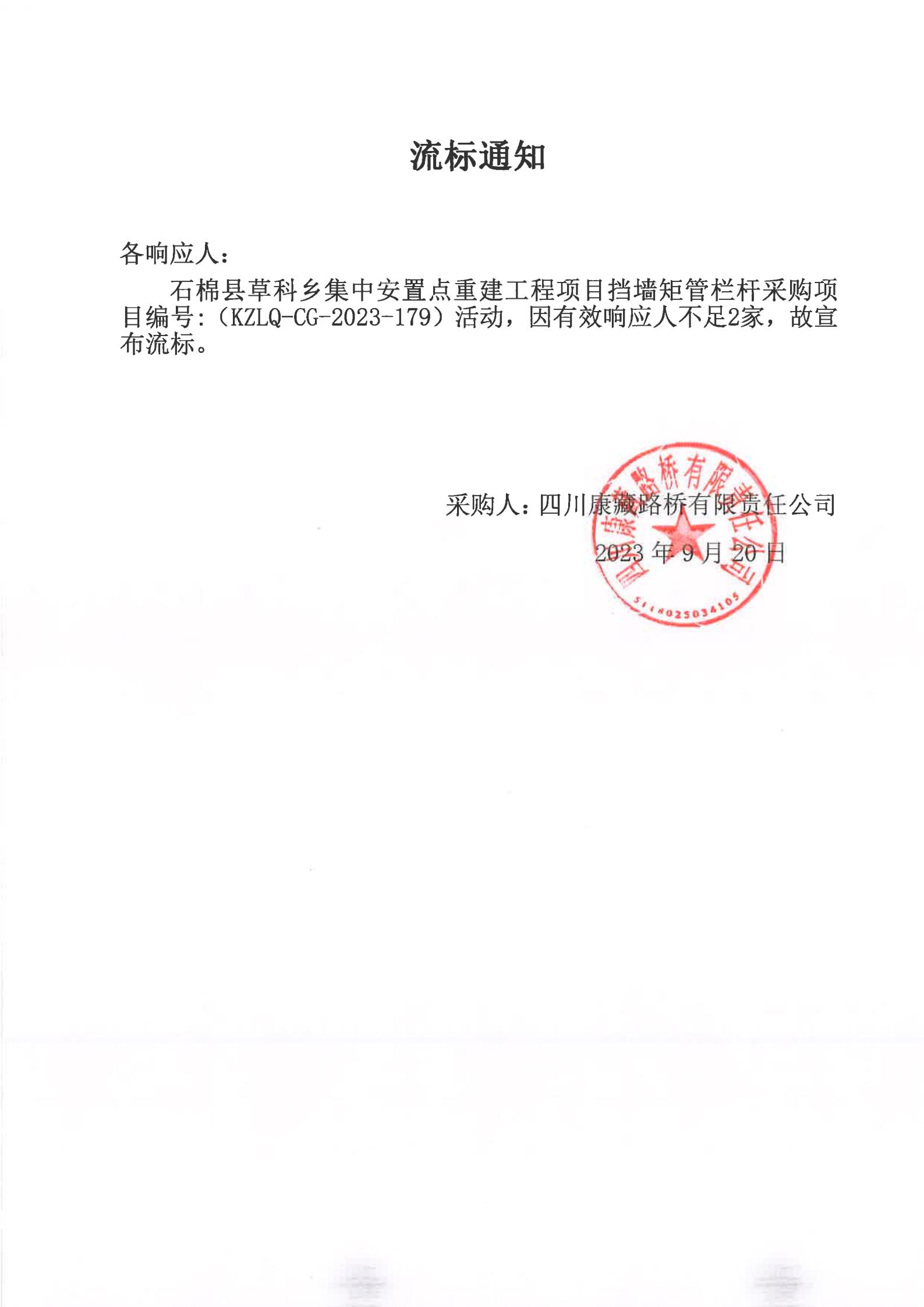 四川康藏路橋有限責(zé)任公司石棉草科鄉(xiāng)集中安置點(diǎn)重建工程項(xiàng)目擋墻矩管欄桿采購項(xiàng)目流標(biāo)通知