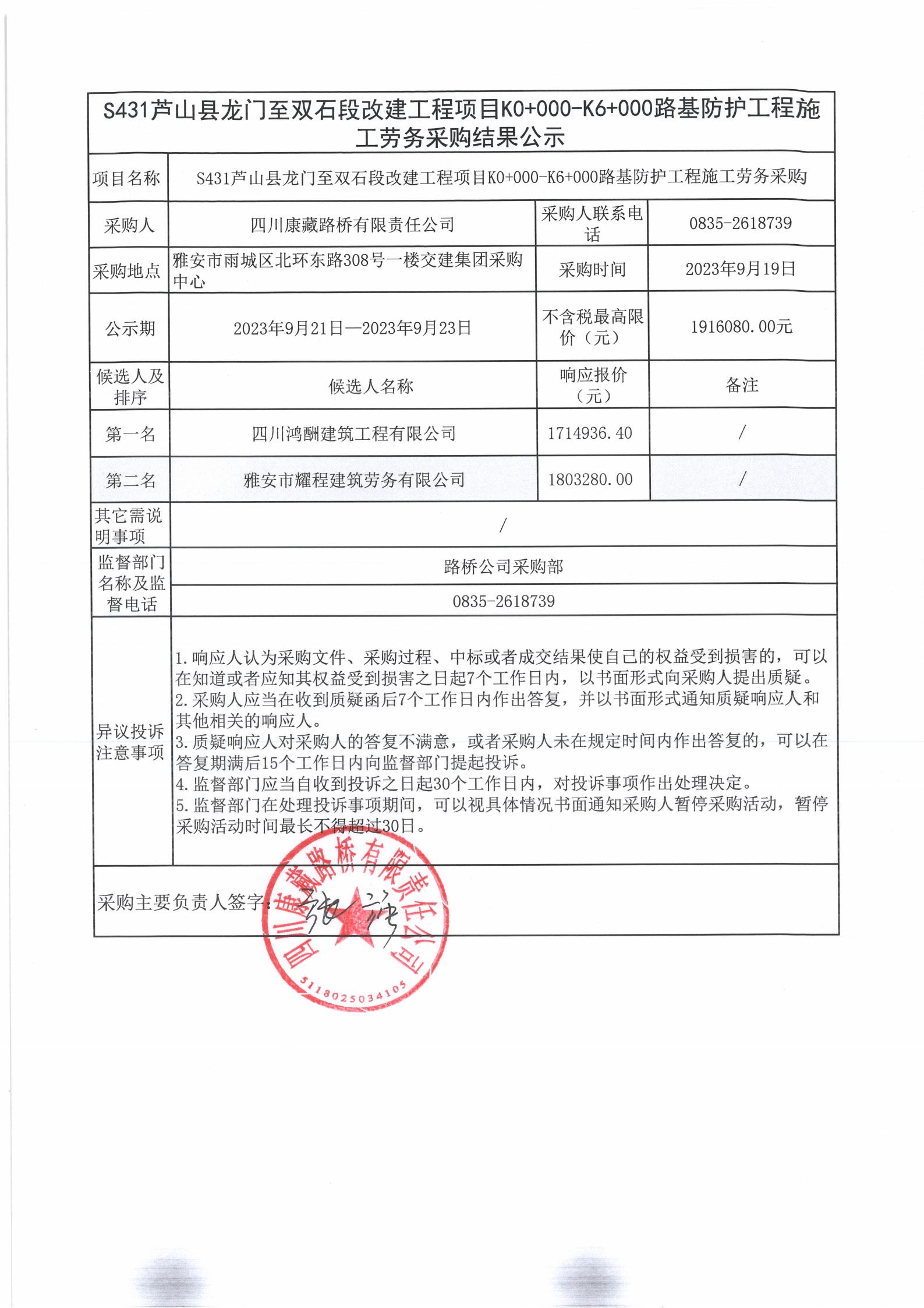 四川康藏路橋有限責(zé)任公司S431蘆山縣龍門至雙石段改建工程項目K0+000-K6+000路基防護(hù)工程施工勞務(wù)采購結(jié)果公示