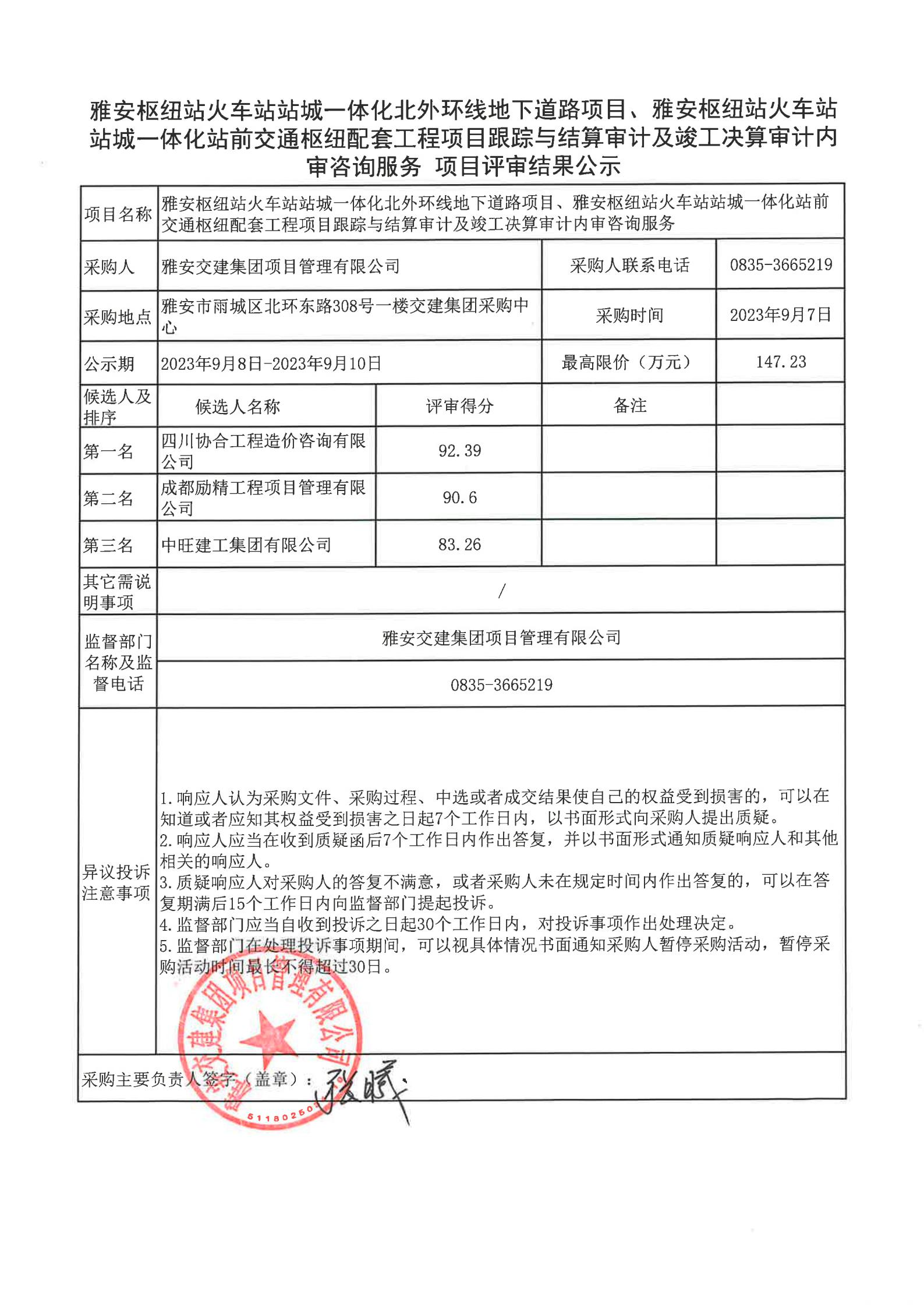 雅安交建集團(tuán)項(xiàng)目管理有限公司雅安樞紐站火車站站城一體化北外環(huán)線地下道路項(xiàng)目、樞紐站火車站站成一體化站前交通樞紐配套工程項(xiàng)目跟蹤與結(jié)算審計(jì)及竣工決算審計(jì)內(nèi)審咨詢服務(wù)項(xiàng)目評審結(jié)果公示