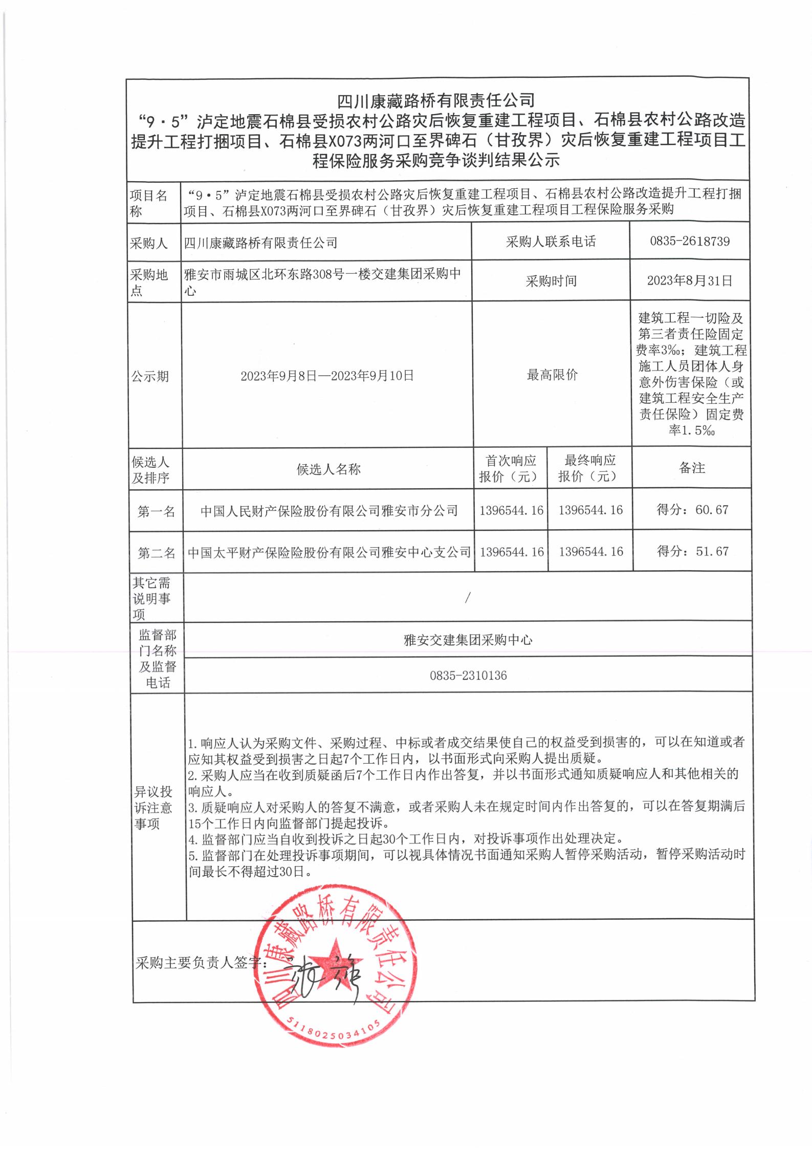 四川康藏路橋有限責(zé)任公司“9·5”瀘定地震石棉縣農(nóng)村公路災(zāi)后恢復(fù)重建工程項目、石棉縣農(nóng)村公路改造提升工程打捆項目、石棉縣X073兩河口至界碑石(甘孜界)災(zāi)后恢復(fù)重建工程項目工程保險服務(wù)采購競爭談判結(jié)果公示
