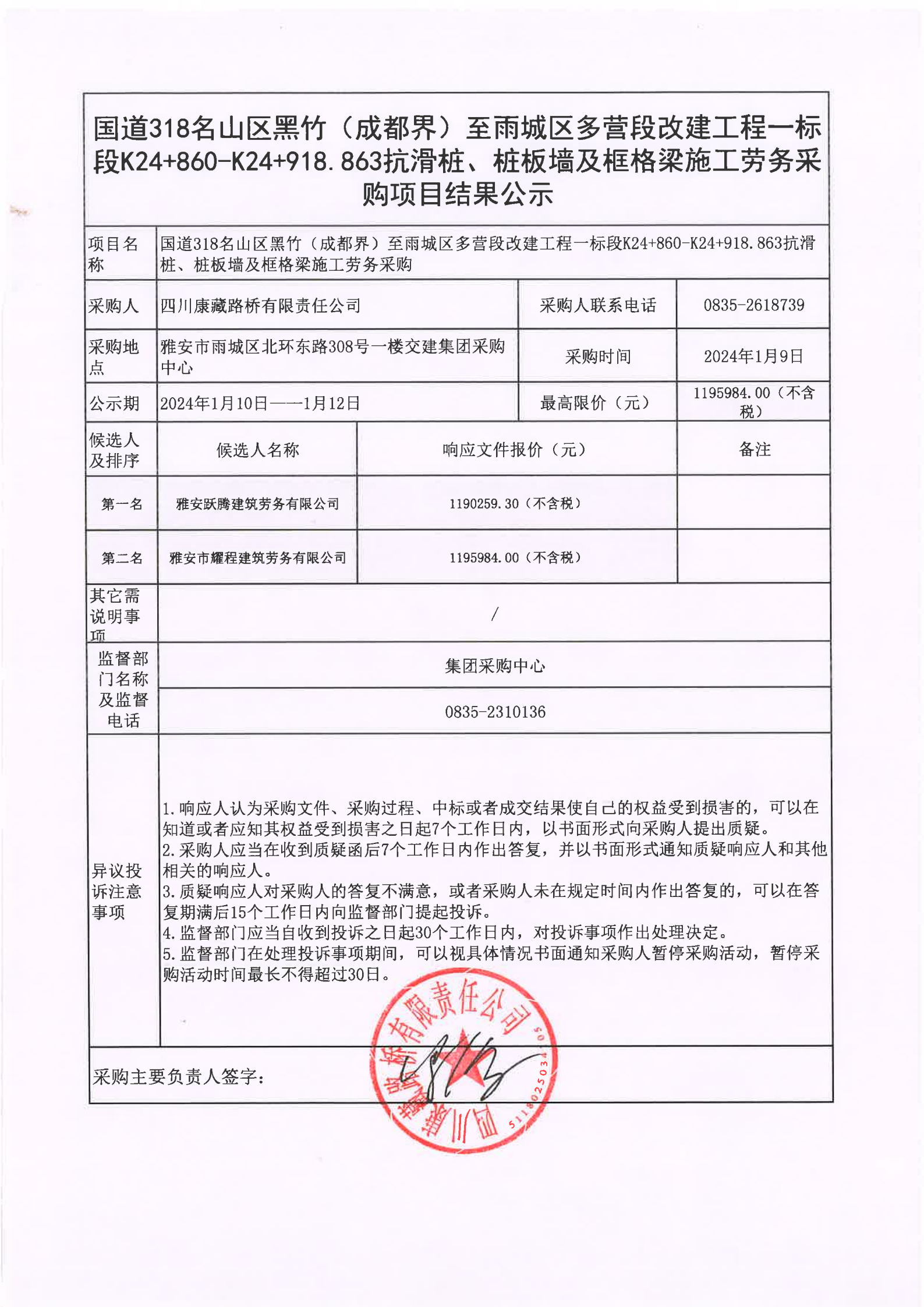 四川康藏路橋有限責任公司國道318名山區(qū)黑竹(成都界)至雨城區(qū)多營段改建工程一標段K24+860-K24+918.863抗滑樁、樁板墻及框格梁施工勞務采購項目結果公示