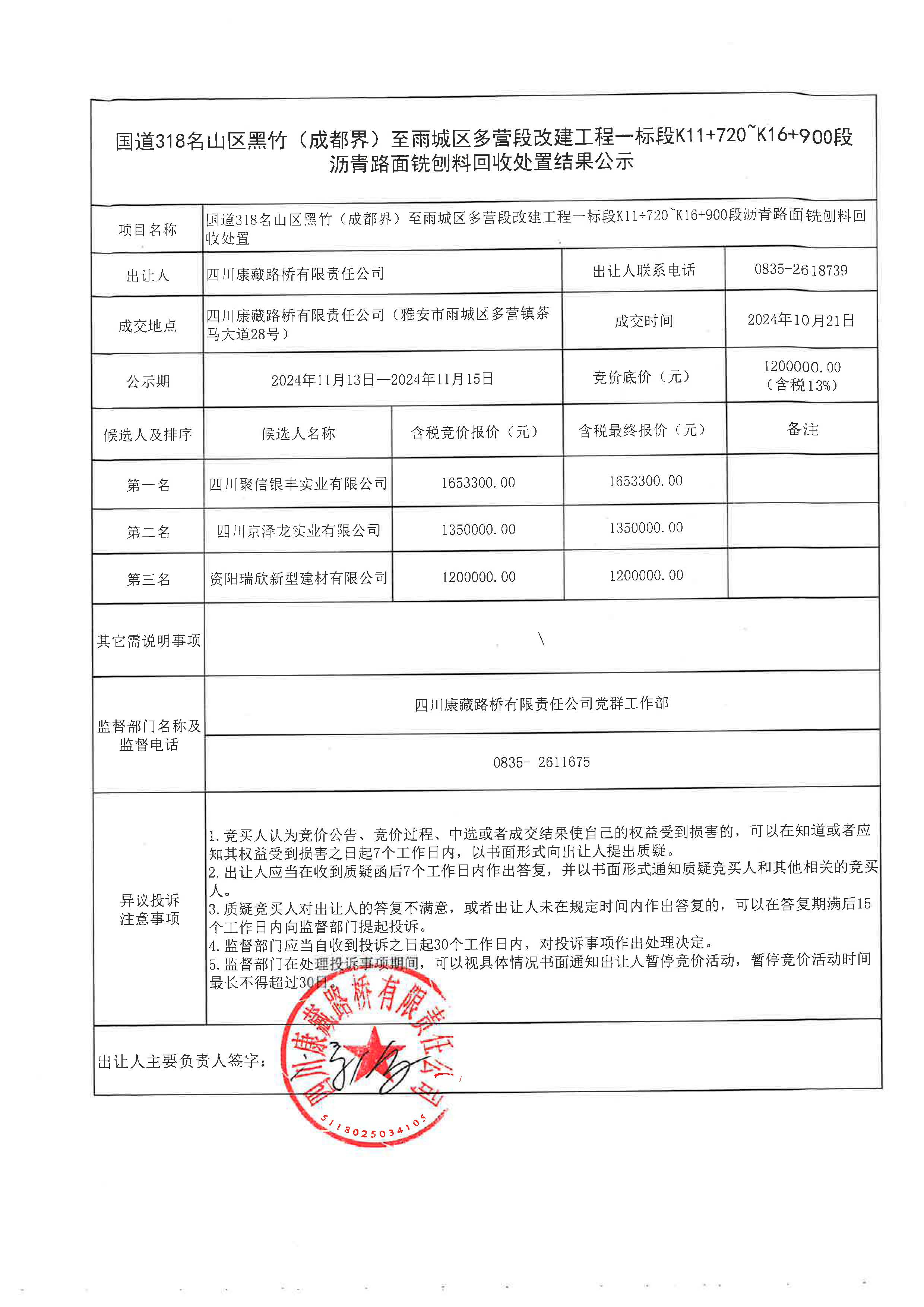 四川康藏路橋有限責任公司國道318名山區(qū)黑竹(成都界)至雨城區(qū)多營段改建工程一標段K11+720~K16+900段瀝青路面銑刨料回收處置結果公示