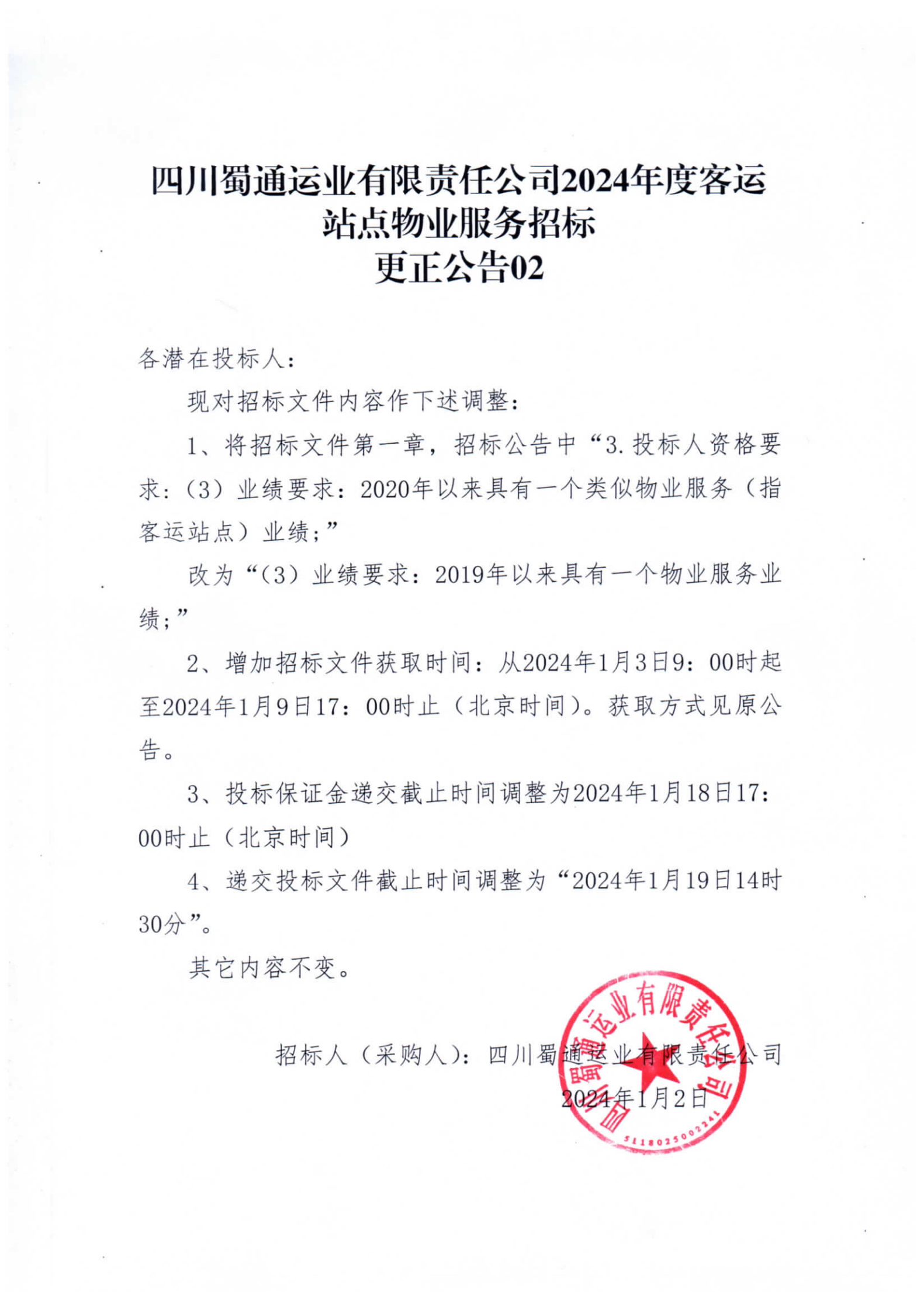 四川蜀通運業(yè)有限責任公司2024年度客運站點物業(yè)服務(wù)招標更正公告02