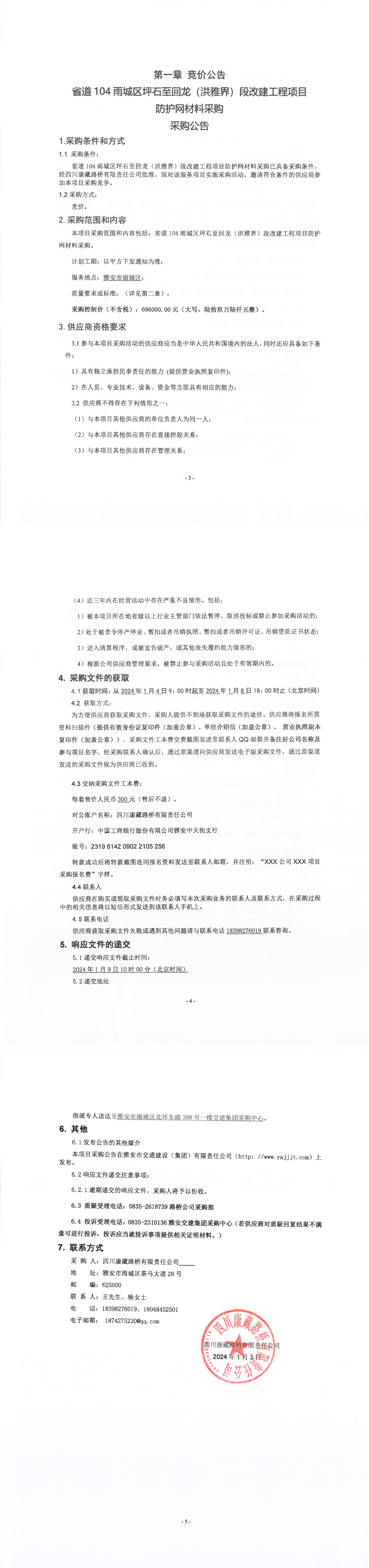 四川康藏路橋有限責任公司省道104雨城區(qū)坪石至回龍(洪雅界)段改建工程項目防護網(wǎng)材料采購公告