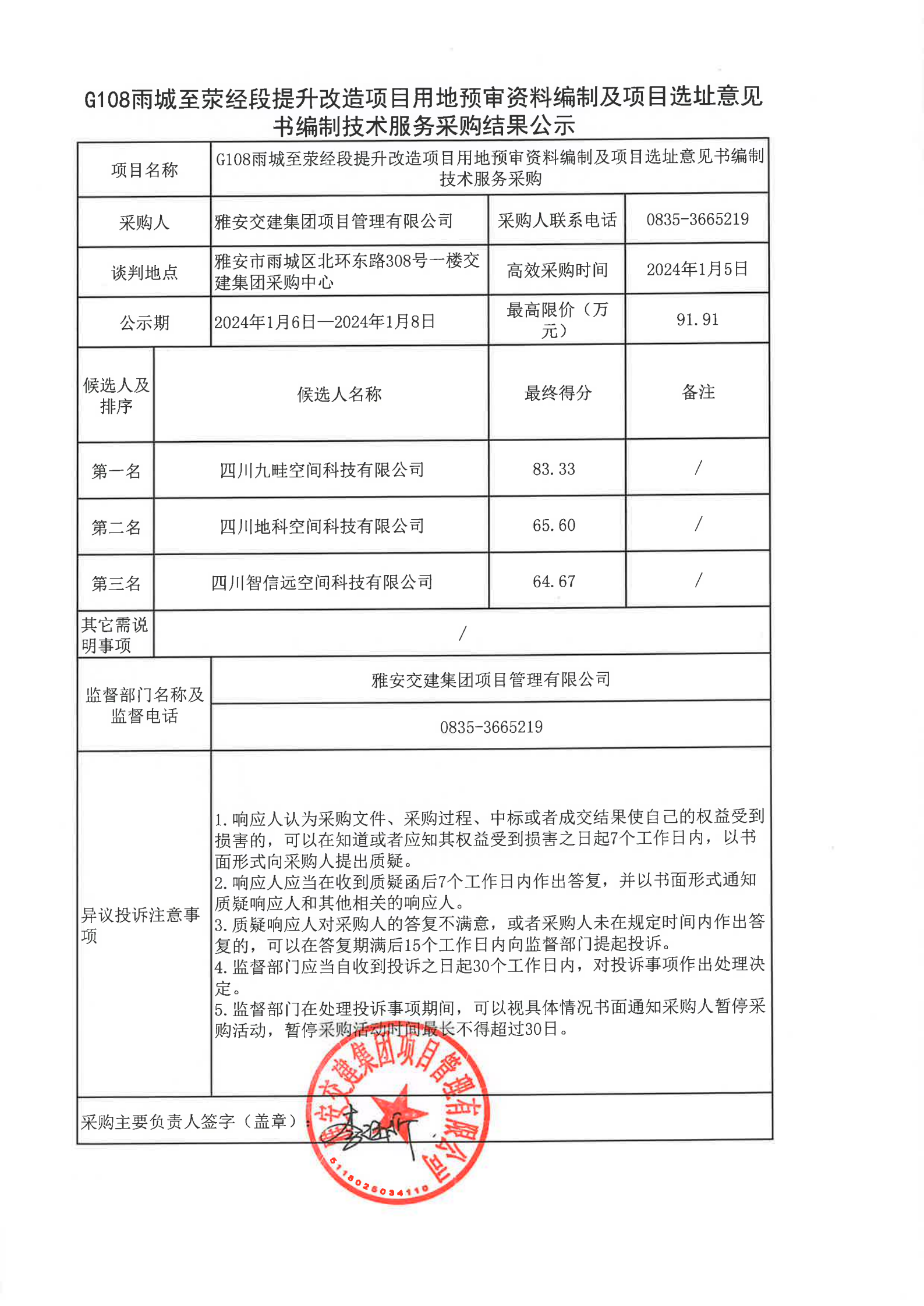 雅安交建集團(tuán)項(xiàng)目管理有限公司G108雨城至滎經(jīng)段提升改造項(xiàng)目用地預(yù)審資料編制及項(xiàng)目選址意見書編制技術(shù)服務(wù)采購結(jié)果公示