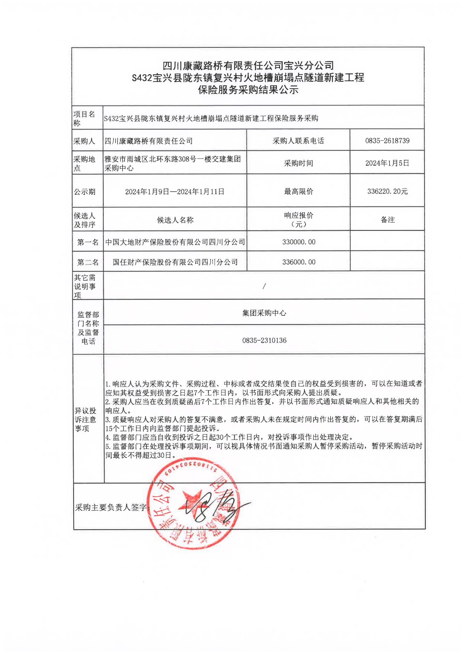 四川康藏路橋有限責(zé)任公司S432寶興縣隴東鎮(zhèn)復(fù)興村火地槽崩塌點(diǎn)隧道新建工程保險(xiǎn)服務(wù)采購(gòu)結(jié)果公示