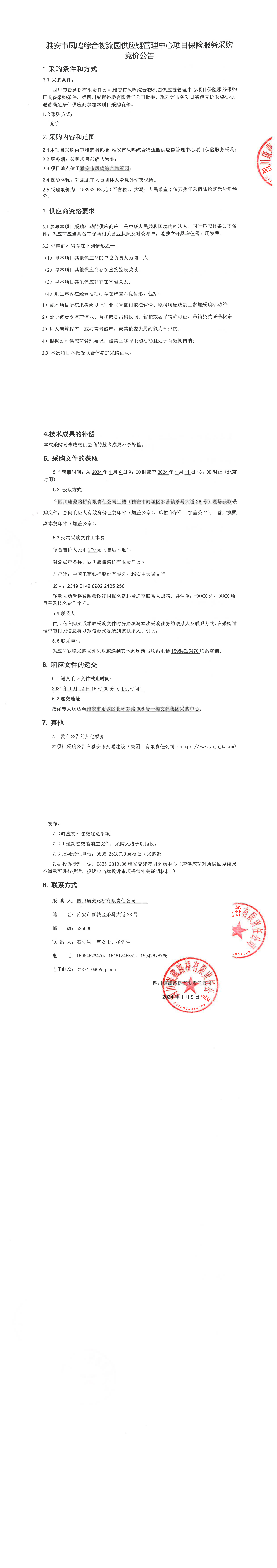 四川康藏路橋有限責(zé)任公司雅安鳳鳴綜合物流園供應(yīng)鏈管理中心項(xiàng)目保險(xiǎn)服務(wù)采購(gòu)競(jìng)價(jià)公告