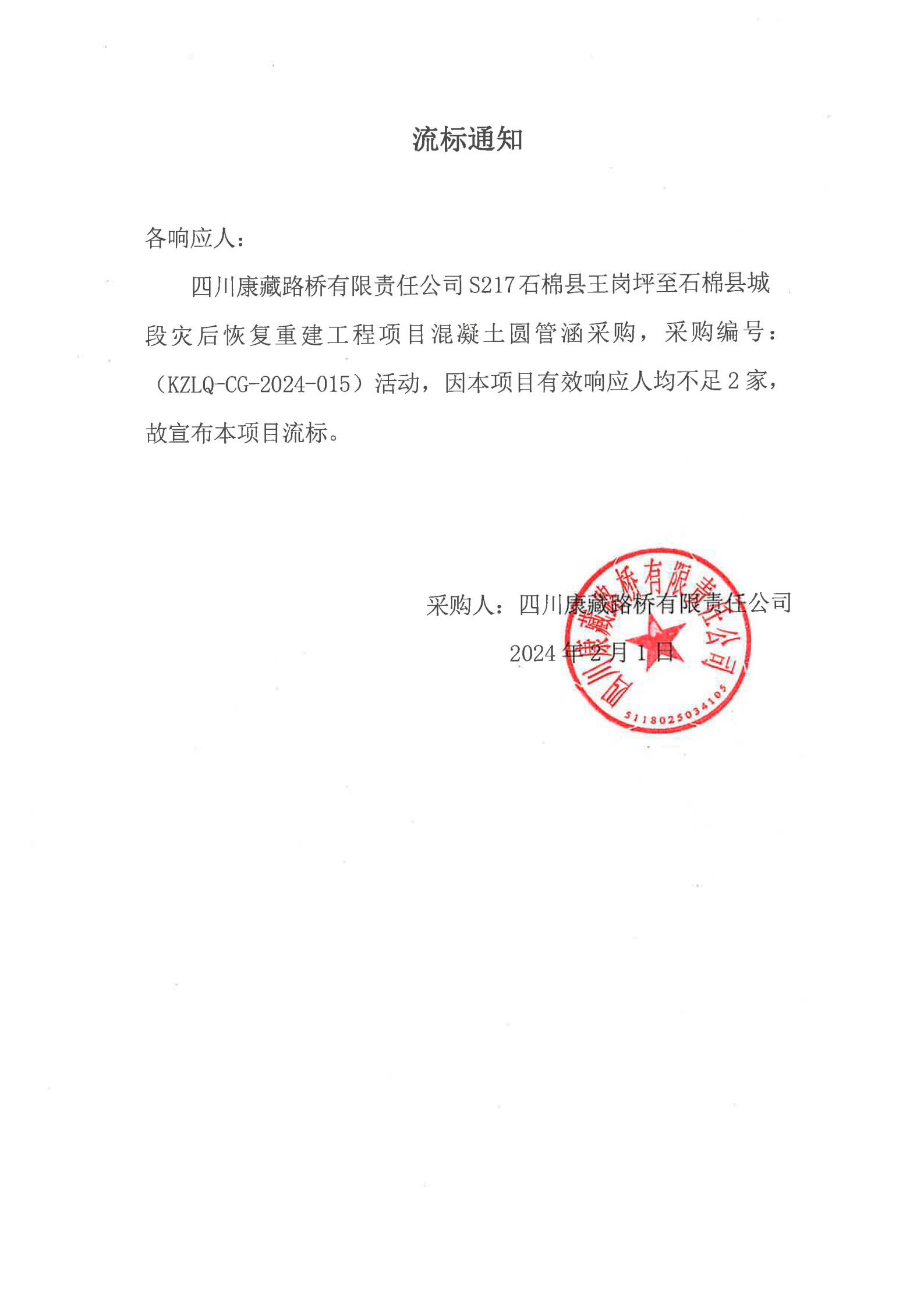 四川康藏路橋有限責任公司S217石棉縣王崗坪至石棉縣城段災后恢復重建工程項目混凝土圓管涵采購流標通知