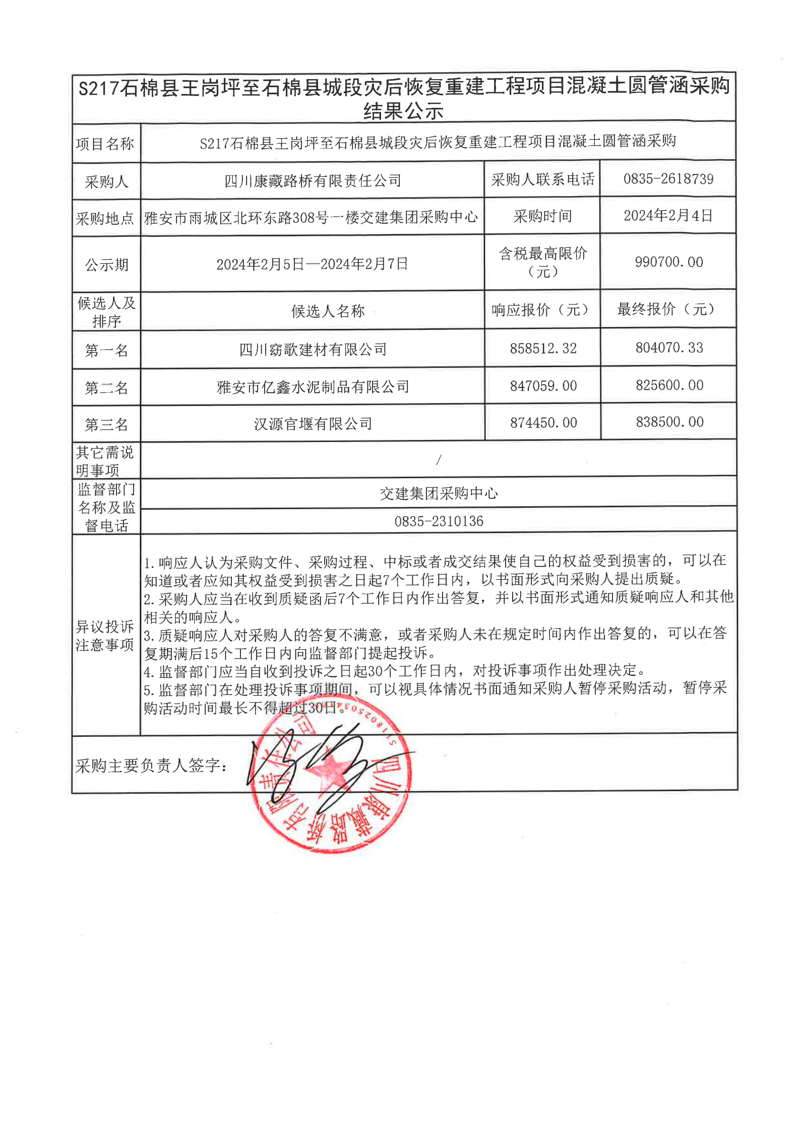 四川康藏路橋有限責(zé)任公司S217石棉縣王崗坪至石棉縣城段災(zāi)后恢復(fù)重建工程項(xiàng)目混凝土圓管涵采購(gòu)結(jié)果公示
