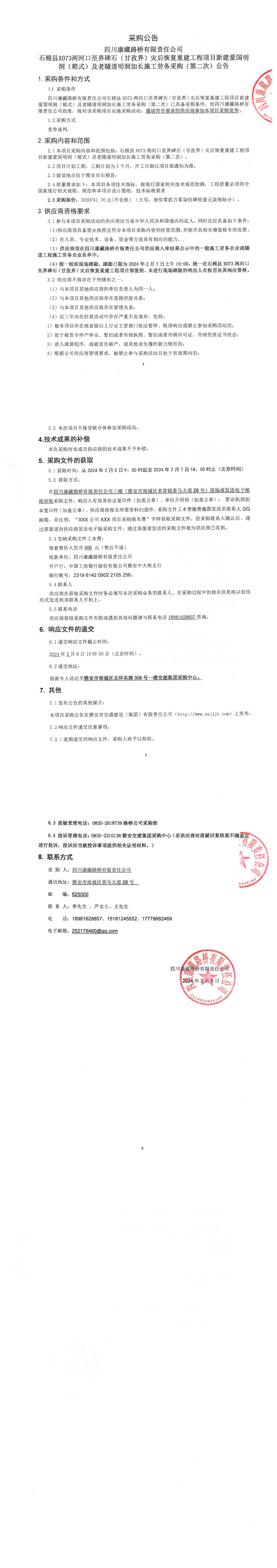 四川康藏路橋有限責任公司石棉縣X073兩河口至界碑石(甘孜界)災(zāi)后恢復重建工程項目新建愛國明洞(箱式)及老隧道明洞加長施工勞務(wù)采購(第二次)公告