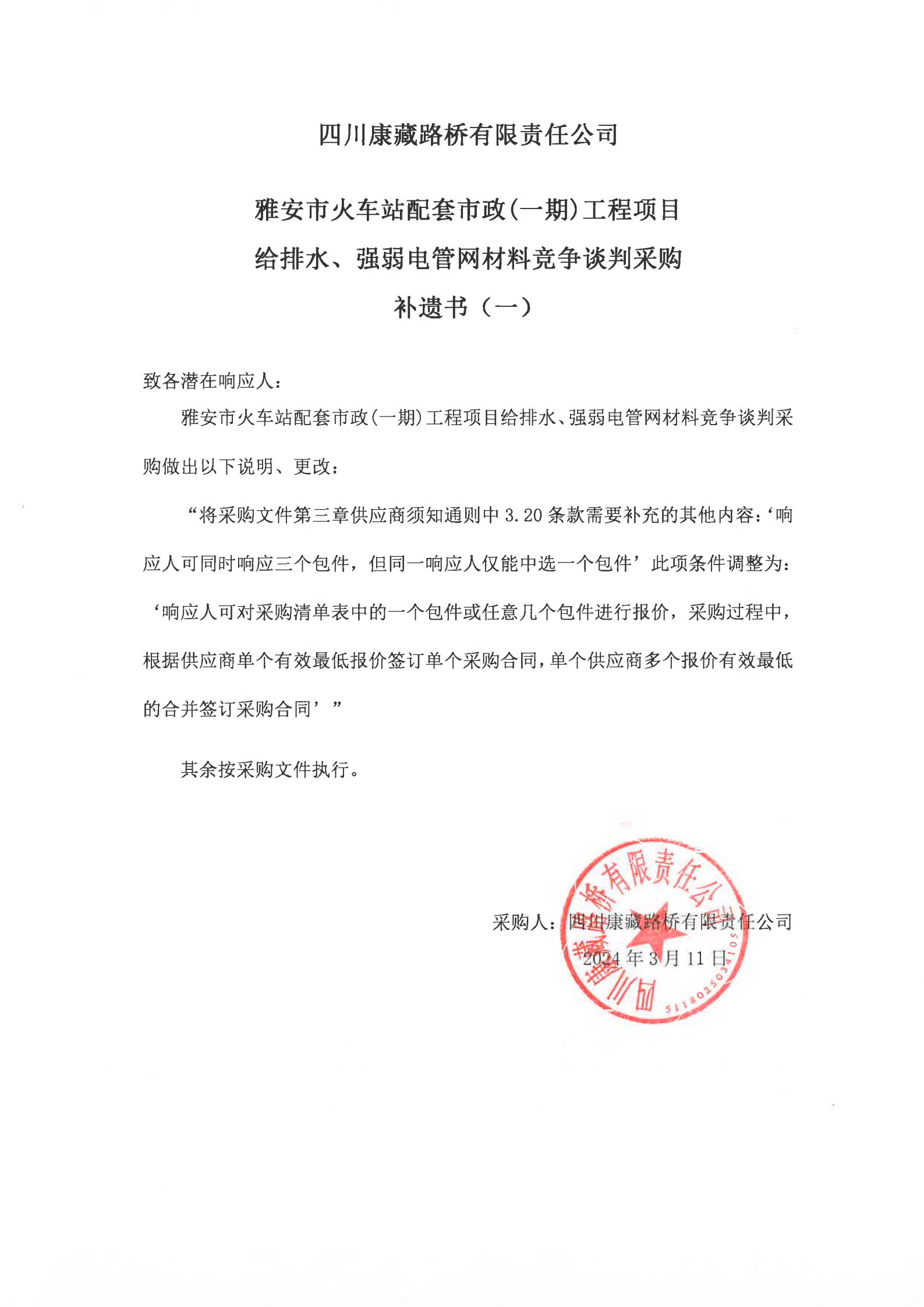 四川康藏路橋有限責(zé)任公司雅安市火車站配套市政(一期)工程項(xiàng)目給排水、強(qiáng)弱電管網(wǎng)材料競(jìng)爭談判采購補(bǔ)遺書