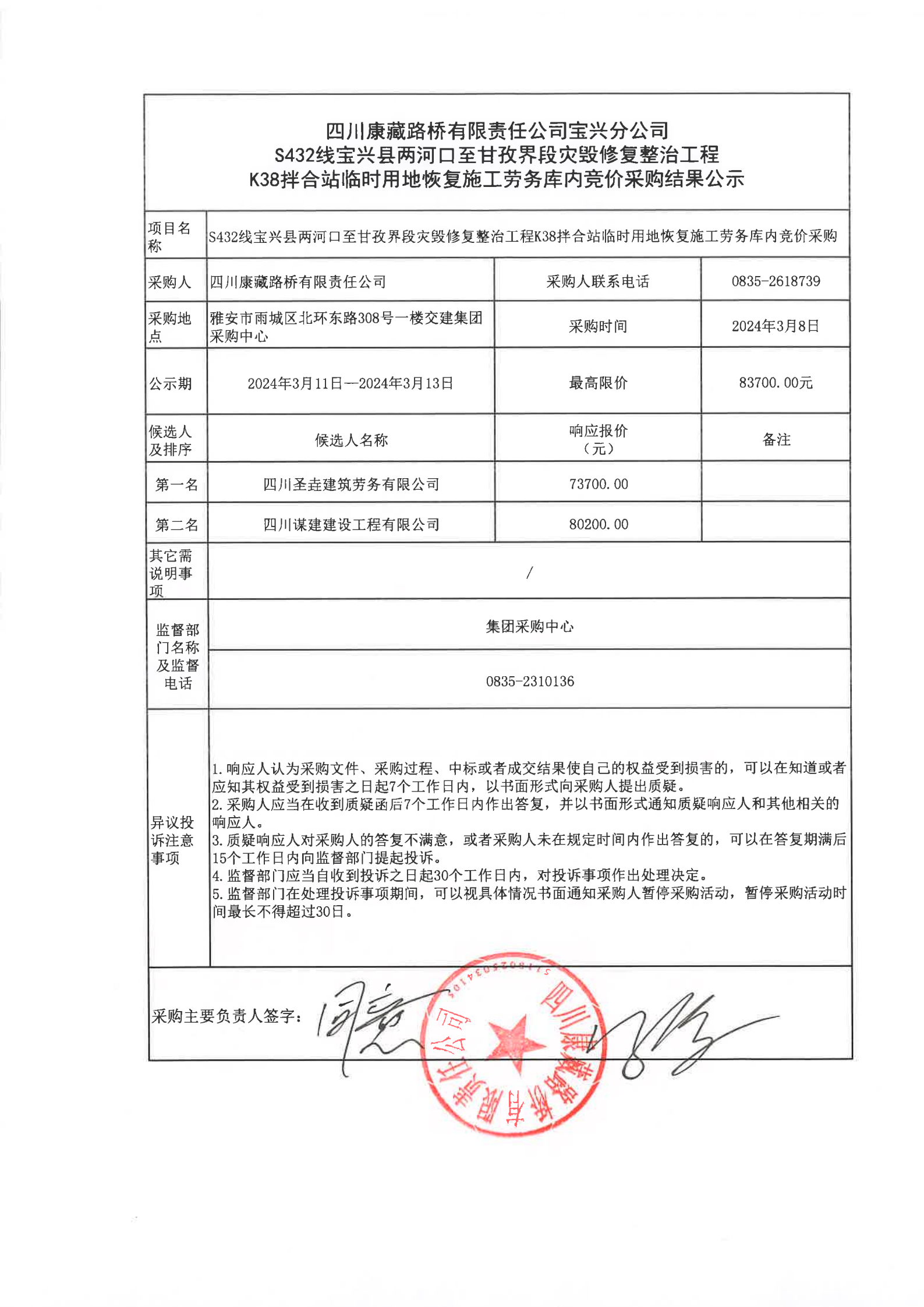 四川康藏路橋有限責(zé)任公司寶興分公司S432線寶興縣兩河口至甘孜界段災(zāi)毀修復(fù)整治工程K38拌合站臨時(shí)用地恢復(fù)施工勞務(wù)庫(kù)內(nèi)競(jìng)價(jià)采購(gòu)結(jié)果公示
