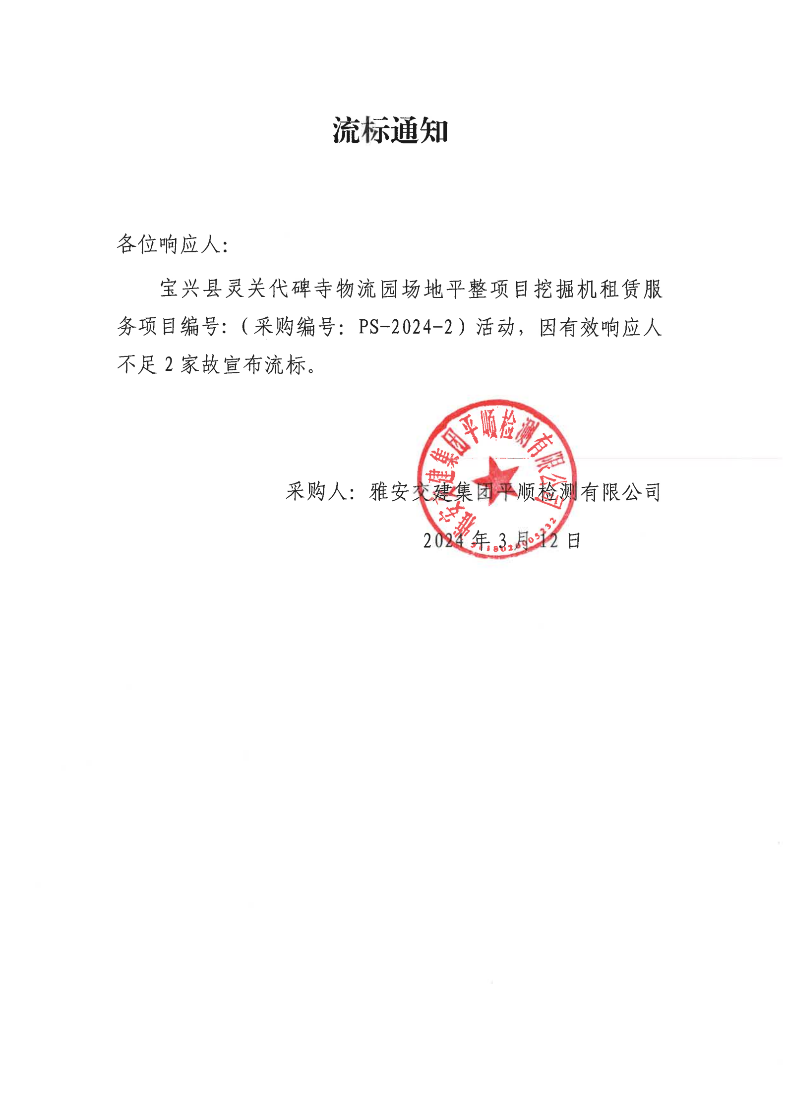 雅安交建集團平順檢測有限公司寶興縣靈關代碑寺物流園場地平整項目挖掘機租賃服務流標通知