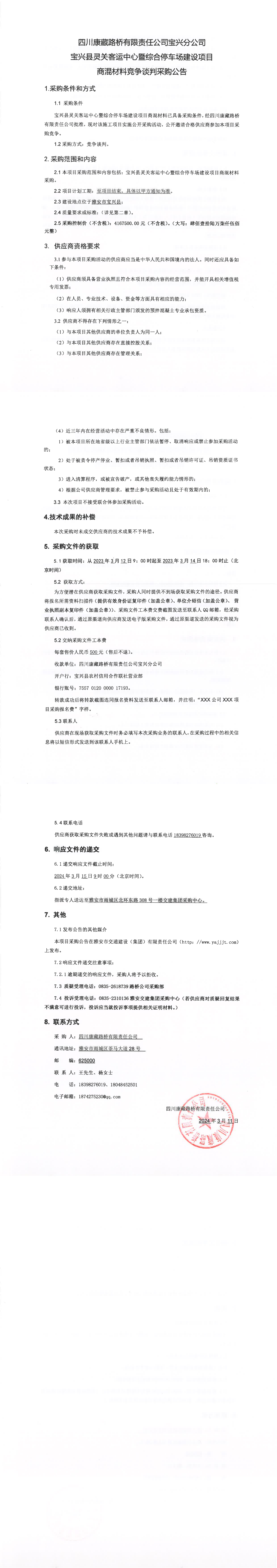 四川康藏路橋有限責(zé)任公司寶興縣靈關(guān)客運(yùn)中心暨綜合停車(chē)場(chǎng)建設(shè)項(xiàng)目商混材料競(jìng)爭(zhēng)談判采購(gòu)公告
