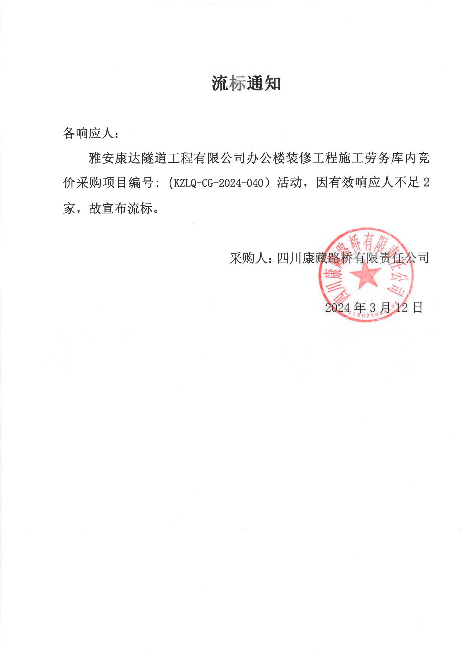 雅安康達(dá)隧道工程有限公司辦公樓裝修工程施工勞務(wù)庫內(nèi)競(jìng)價(jià)采購流標(biāo)通知