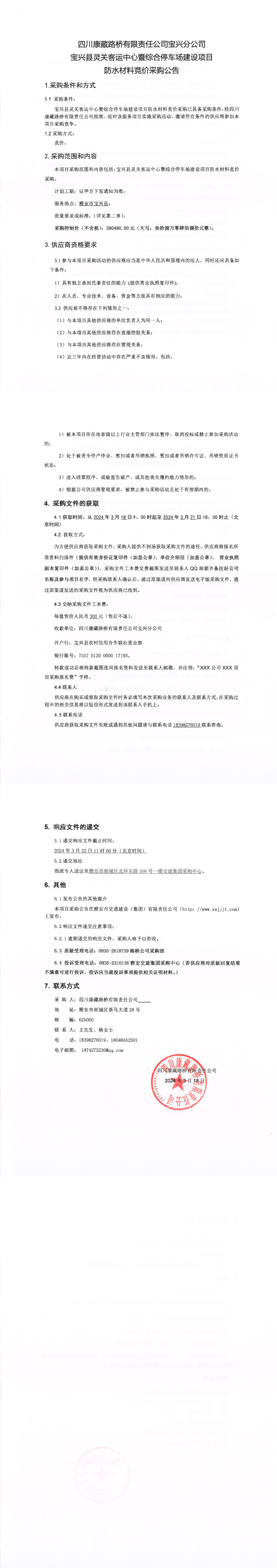 四川康藏路橋有限責(zé)任公司寶興縣靈關(guān)客運(yùn)中心暨綜合停車場建設(shè)項(xiàng)目防水材料競價(jià)采購公告