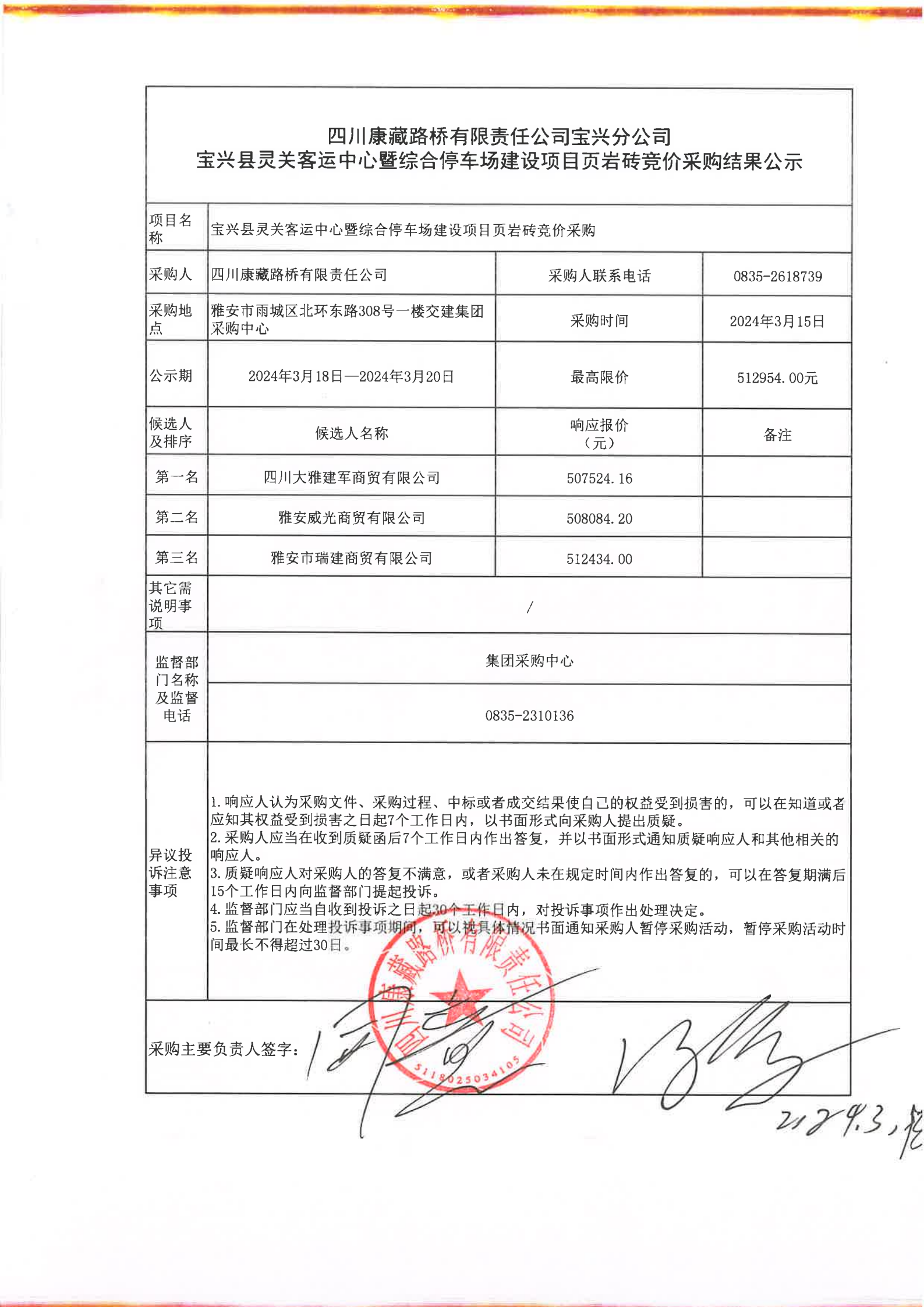 四川康藏路橋有限責(zé)任公司寶興分公司寶興縣靈關(guān)客運中心暨綜合停車場建設(shè)項目頁巖磚競價采購結(jié)果公示