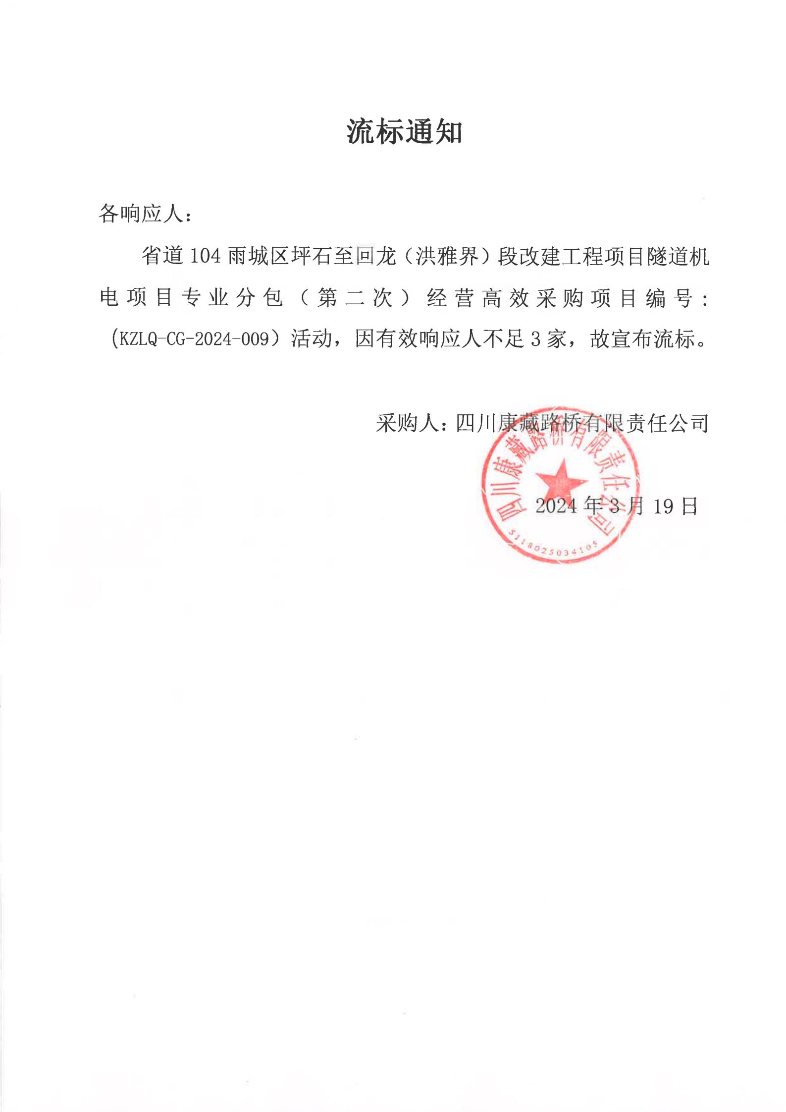 四川康藏路橋有限責任公司省道104雨城區(qū)坪石至回龍(洪雅界)段改建工程項目隧道機電項目專業(yè)分包經(jīng)營高效采購(第二次)流標通知