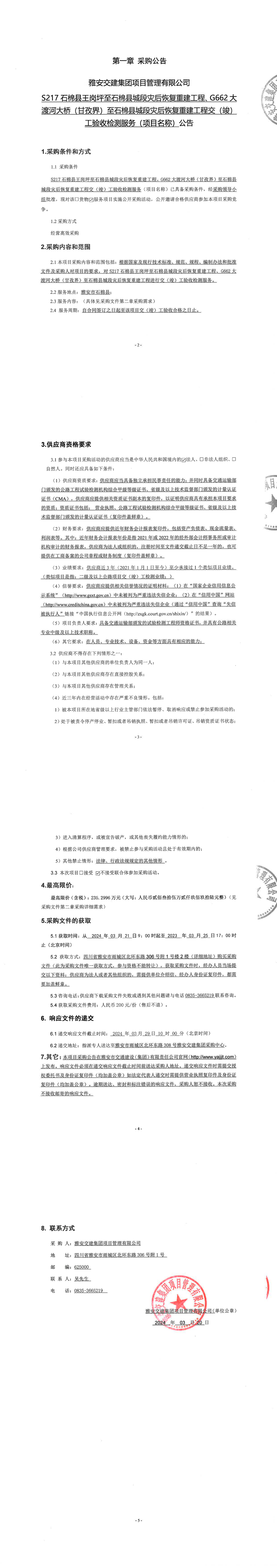 雅安交建集團(tuán)項目管理有限公司S217石棉縣王崗坪至石棉縣城段災(zāi)后恢復(fù)重建工程、G662大渡河大橋(甘孜界)至石棉縣城段災(zāi)后恢復(fù)重建工程交(竣)工驗收檢測服務(wù)(項目名稱)公告
