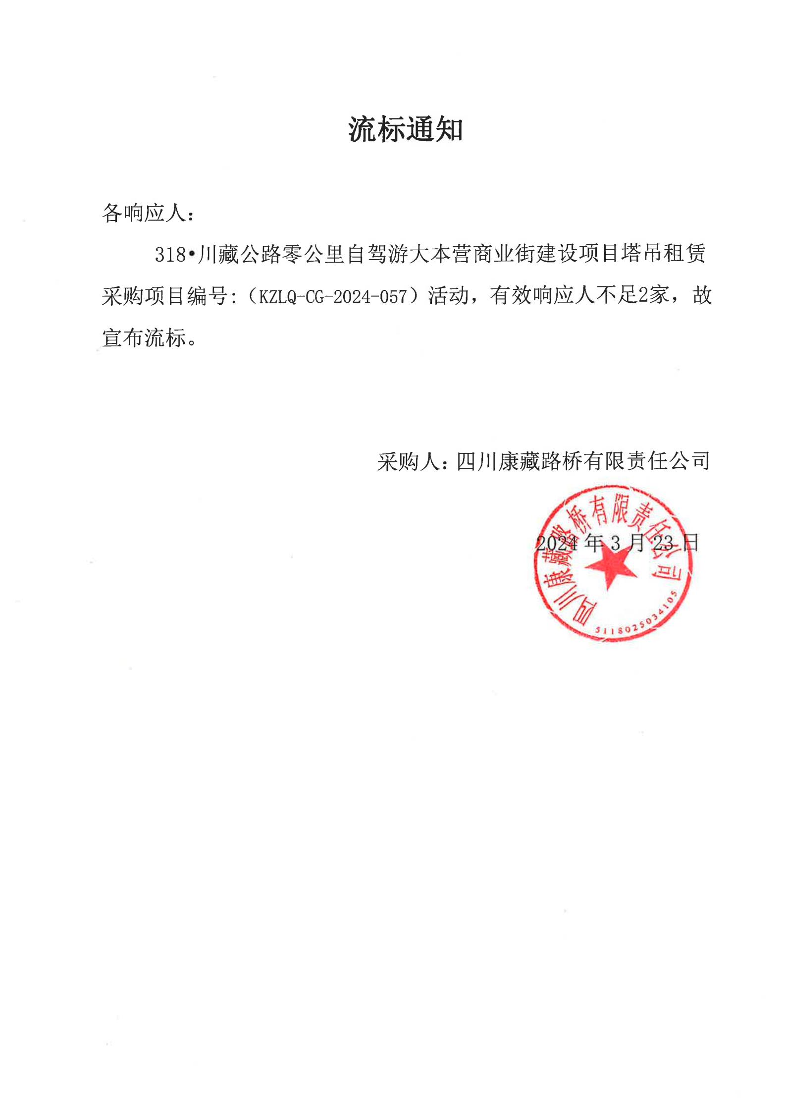 四川康藏路橋有限責(zé)任公司318•川藏公路零公里自駕游大本營商業(yè)街建設(shè)項目塔吊租賃采購流標(biāo)通知