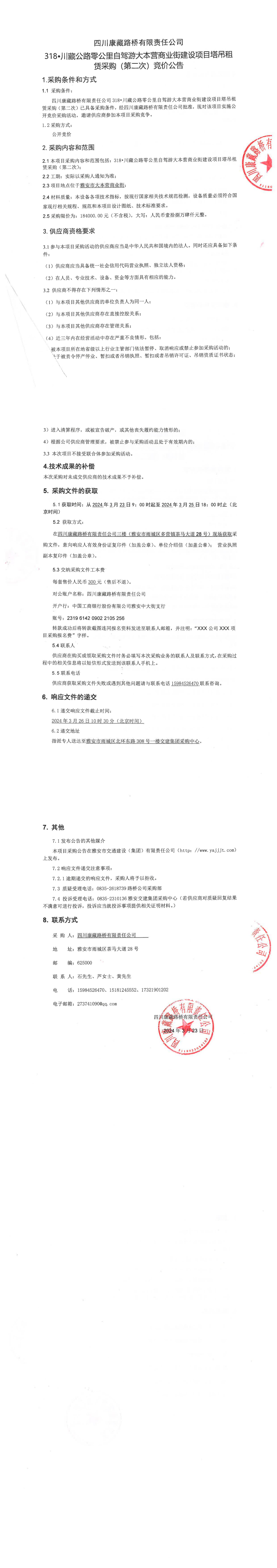 四川康藏路橋有限責(zé)任公司318•川藏公路零公里自駕游大本營商業(yè)街建設(shè)項(xiàng)目塔吊租賃采購(第二次)競價公告