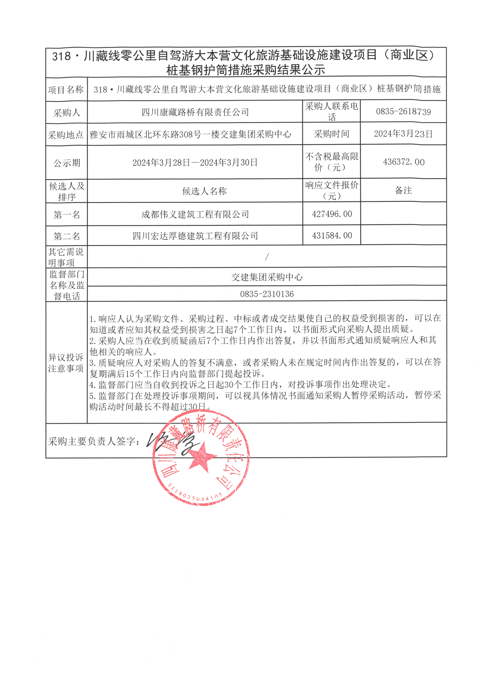 四川康藏路橋有限責(zé)任公司318·川藏公路零公里自駕游大本營(yíng)文化旅游基礎(chǔ)設(shè)施建設(shè)項(xiàng)目(商業(yè)區(qū))樁基鋼護(hù)筒措施采購(gòu)結(jié)果公示