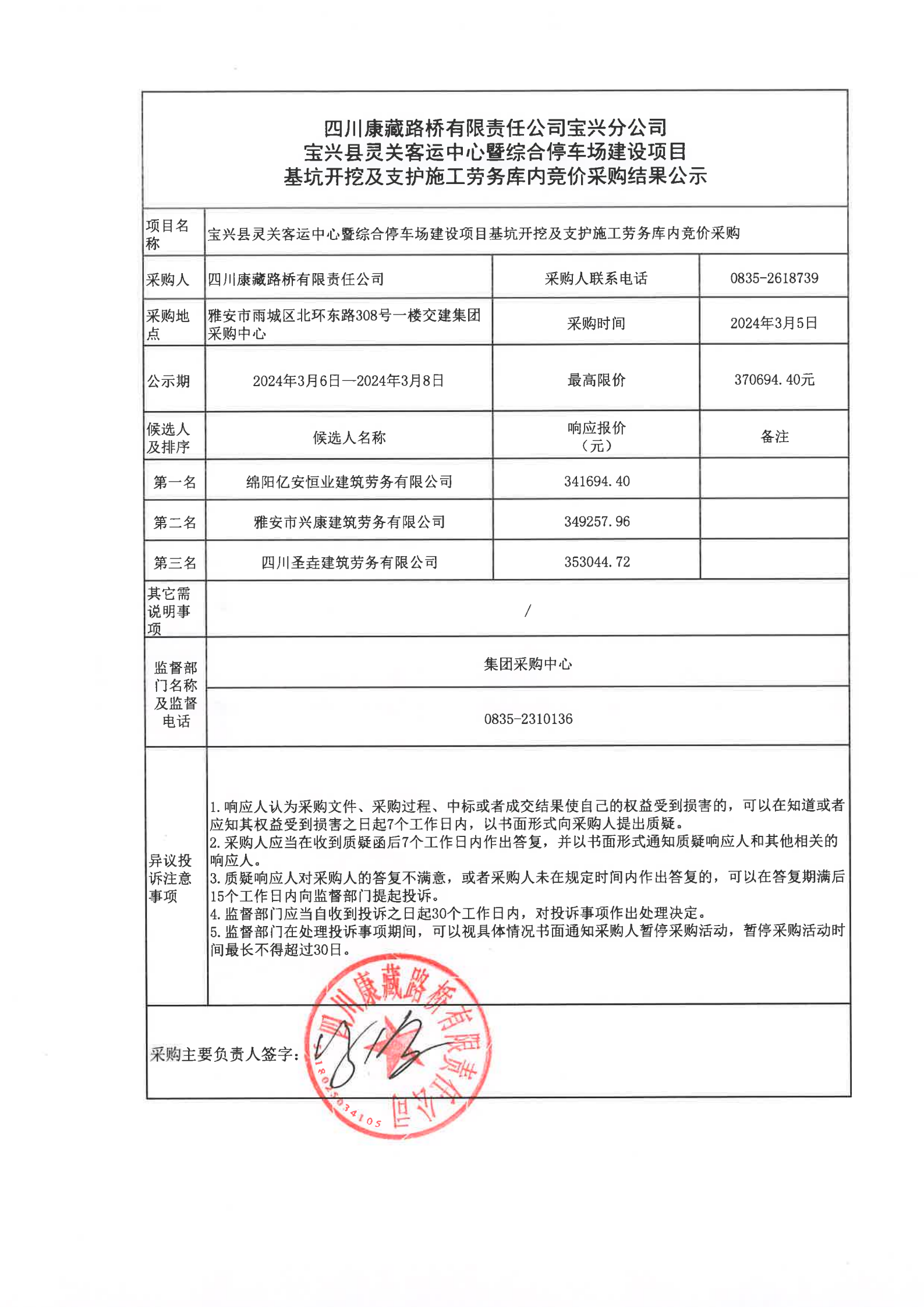四川康藏路橋有限責(zé)任公司寶興分公司寶興縣靈關(guān)客運(yùn)中心暨綜合停車場(chǎng)建設(shè)項(xiàng)目基坑開(kāi)挖及支護(hù)施工勞務(wù)庫(kù)內(nèi)競(jìng)價(jià)采購(gòu)結(jié)果公示