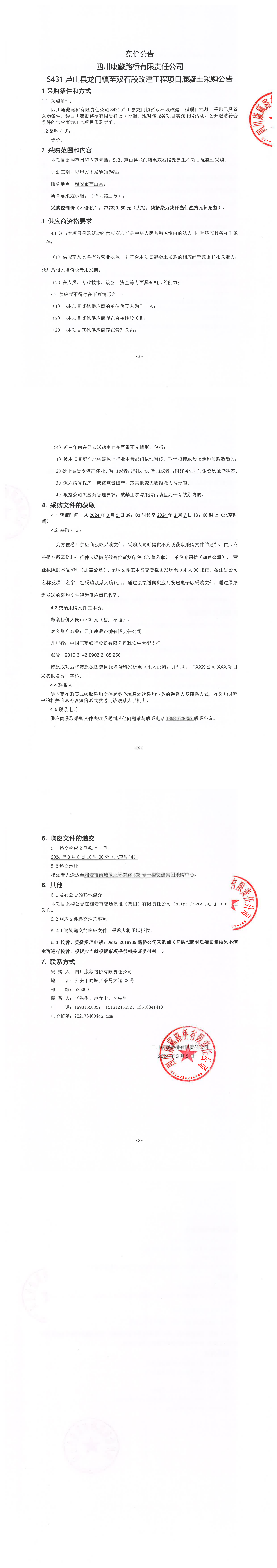 四川康藏路橋有限責(zé)任公司S431蘆山縣龍門鎮(zhèn)至雙石段改建工程項(xiàng)目混凝土采購公告