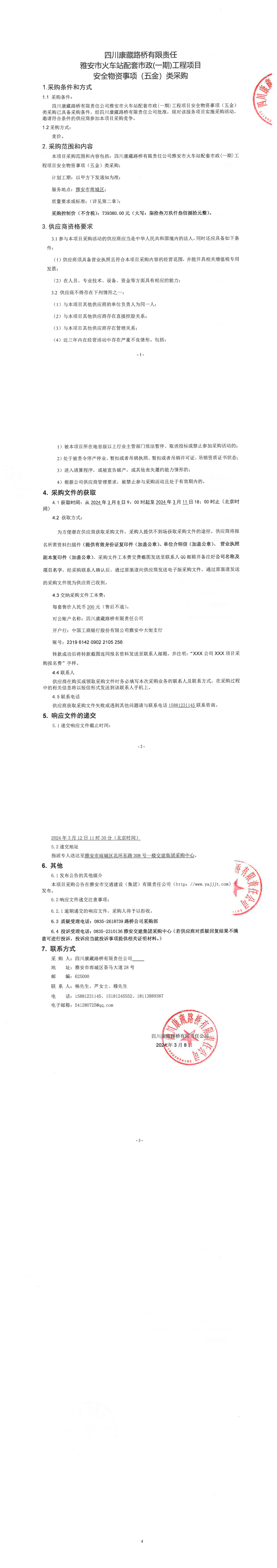 四川康藏路橋有限責(zé)任公司雅安市火車(chē)站配套市政(一期)工程項(xiàng)目安全物資事項(xiàng)(五金)類(lèi)采購(gòu)公告