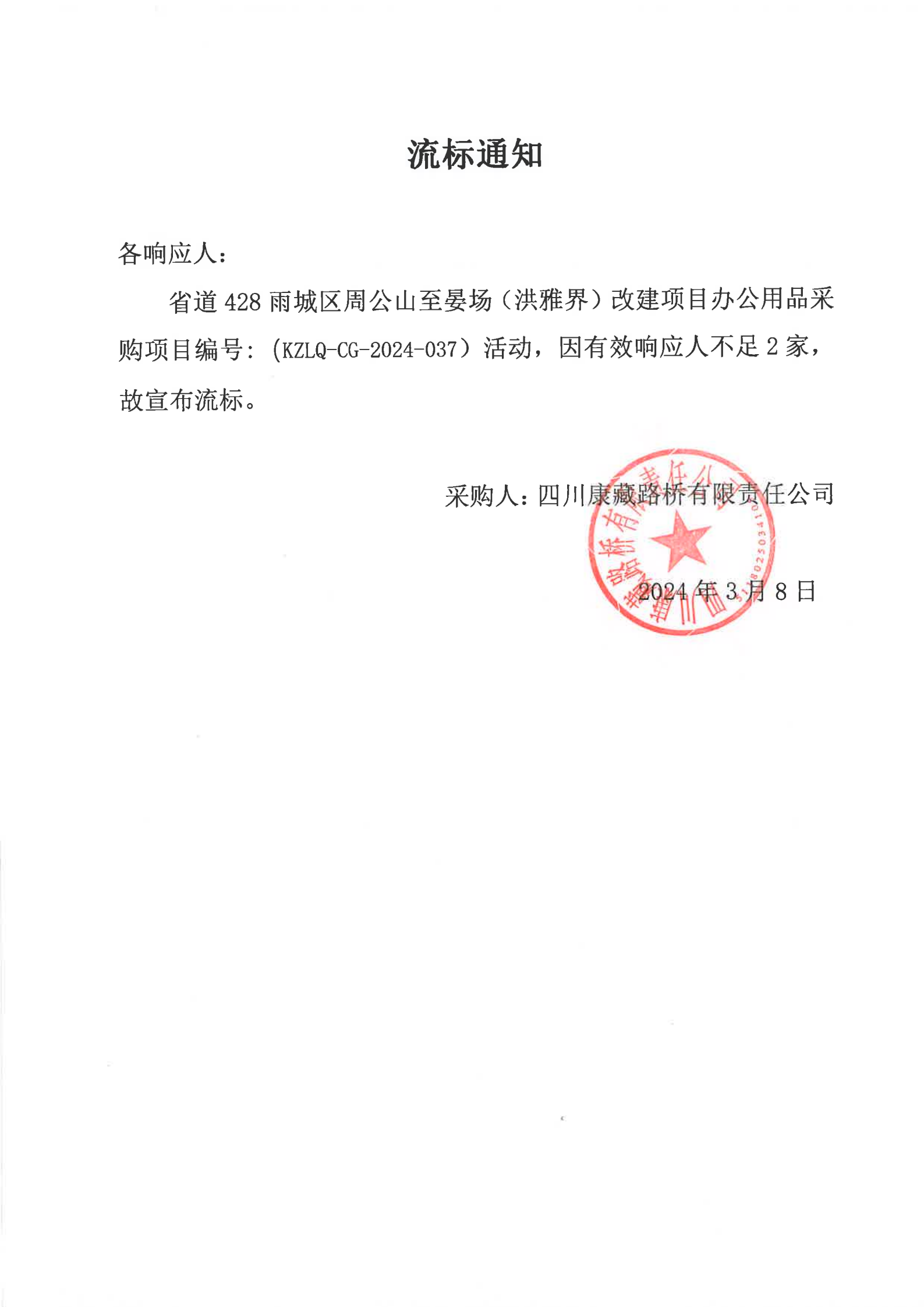 四川康藏路橋有限責任公司省道428雨城區(qū)周公山至晏場(洪雅界)改建項目辦公用品采購流標通知