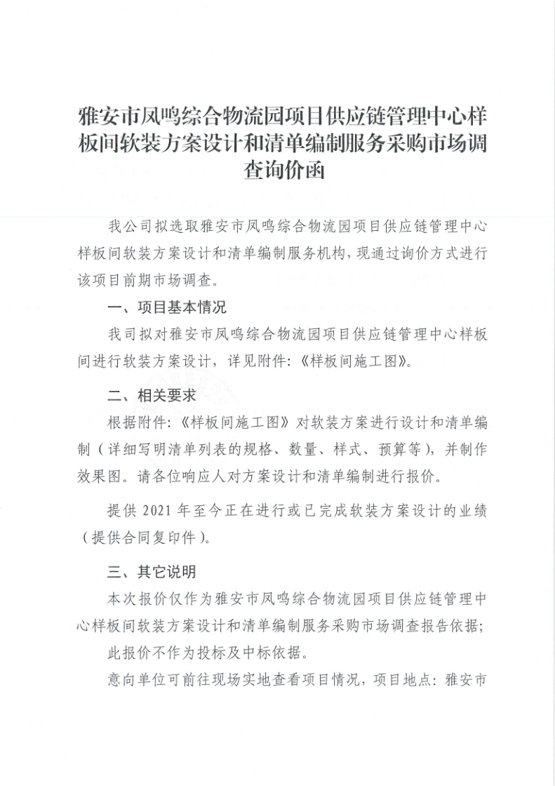 雅安交建集團物流發(fā)展有限公司雅安市鳳鳴綜合物流園項目供應(yīng)鏈管理中心樣板間軟裝方案設(shè)計和清單編制服務(wù)采購市場調(diào)查詢價函