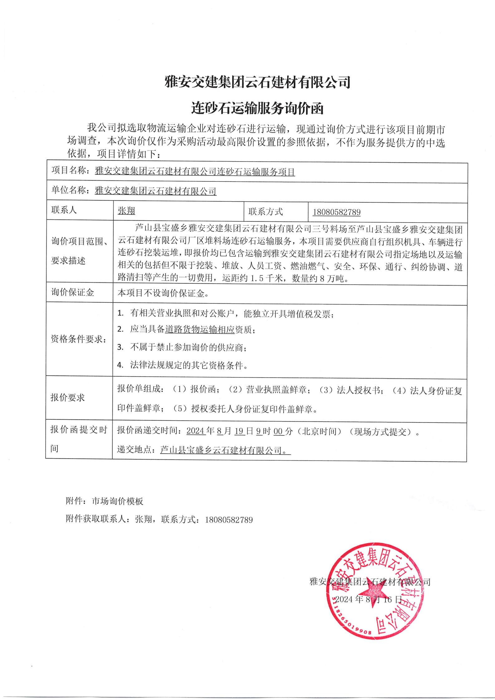 雅安交建集團(tuán)云石建材有限公司連砂石運輸服務(wù)詢價函