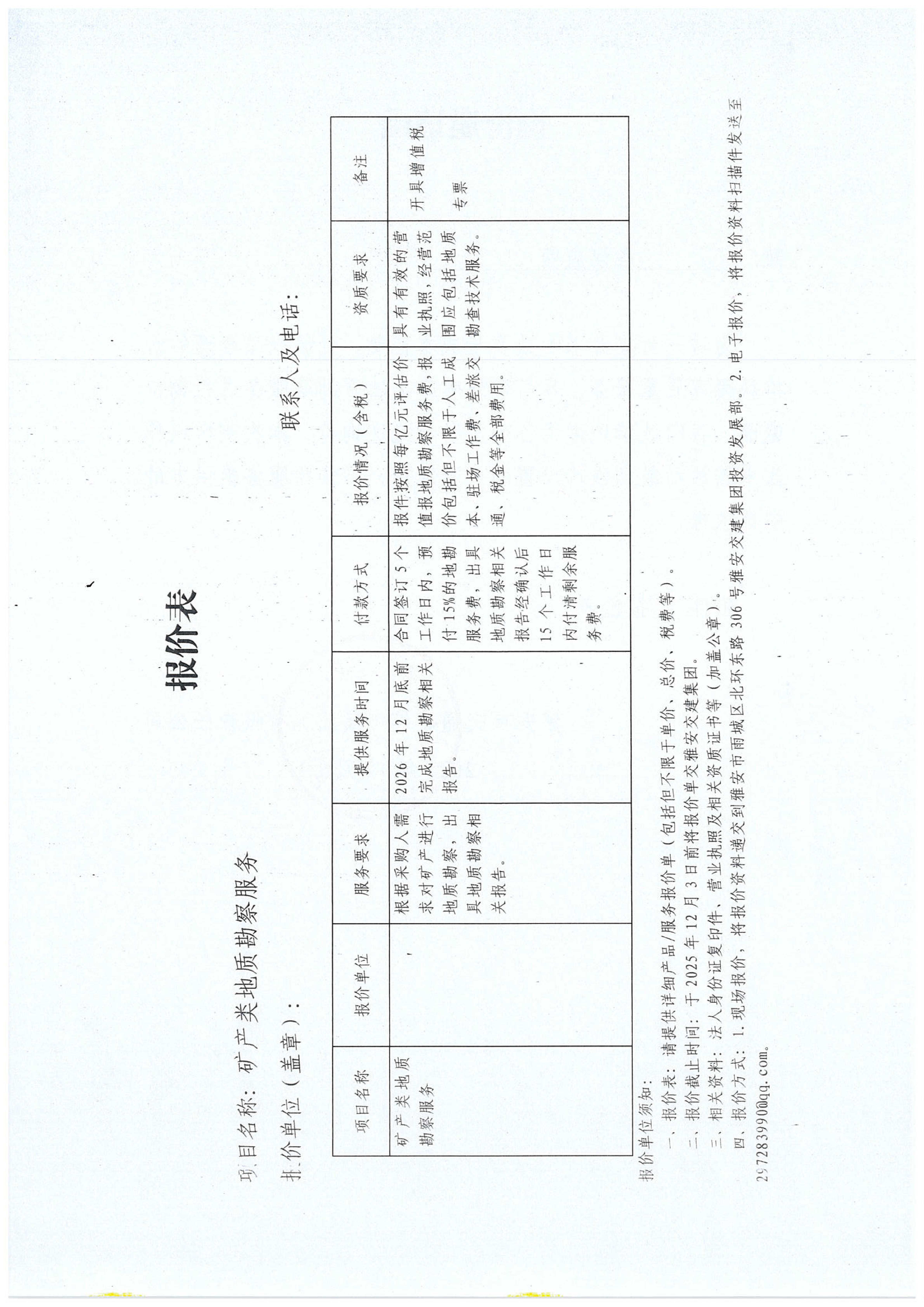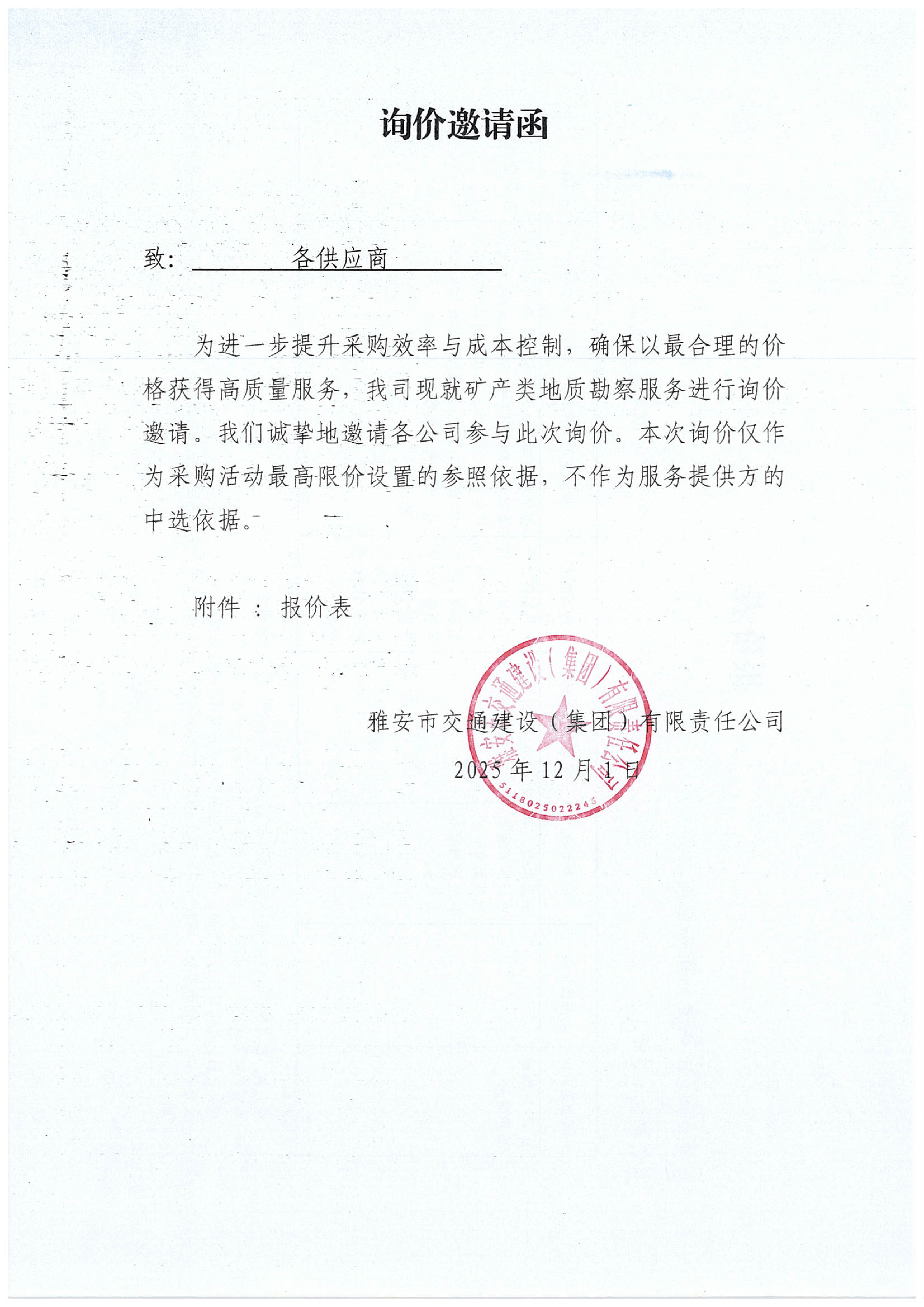 關(guān)于雅安市交通建設(shè)(集團)有限責任公司礦產(chǎn)類地質(zhì)勘察服務(wù)限價的詢價函